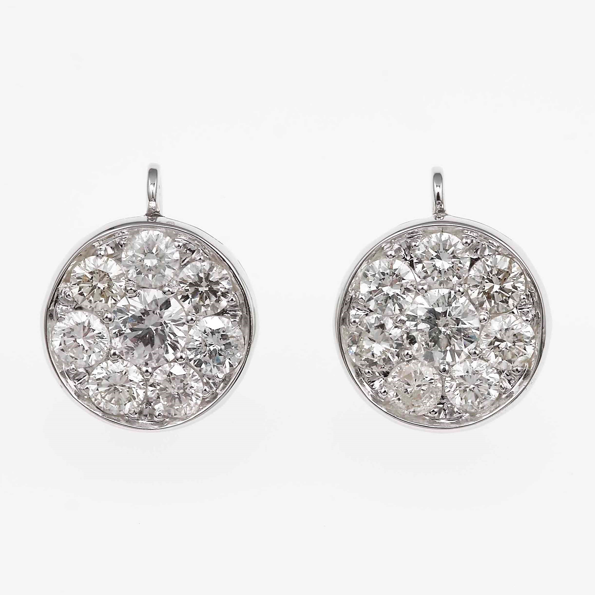 Orecchini con diamanti taglio brillante per ct 3.00 circa totali, montatura in oro bianco 750/1000, punzone 2065MI, gr totali 4,6, cm 1,5, purezza SI/P