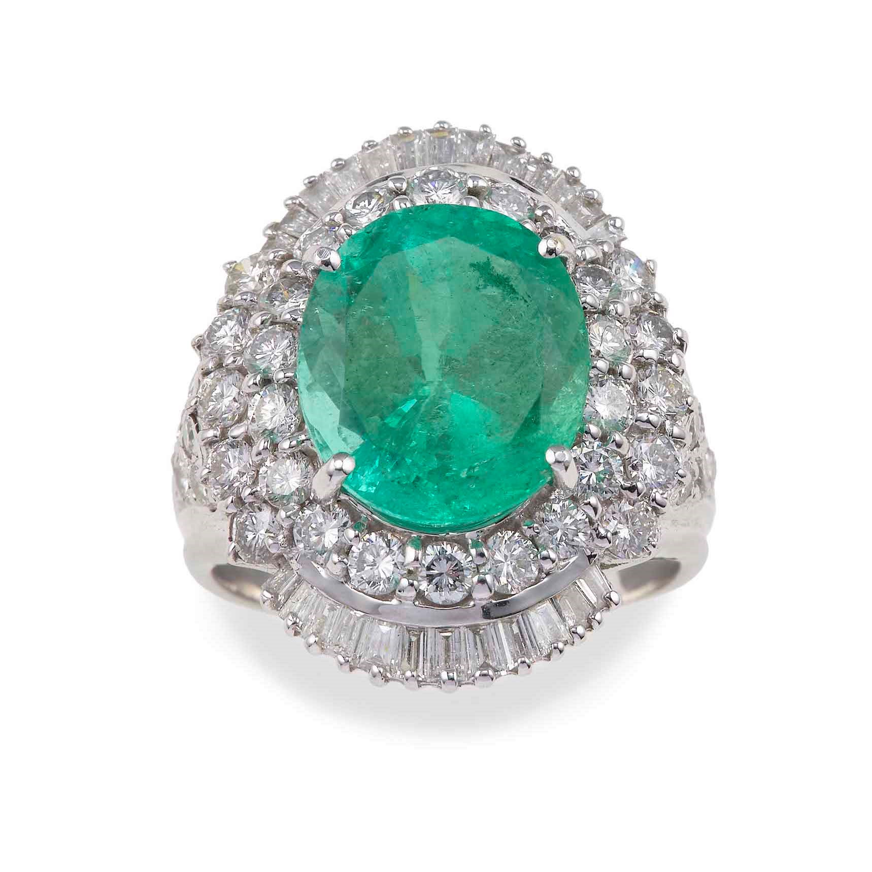Anello con smeraldo Colombia e diamanti, montatura in oro bianco 750/1000, gr. 12,8