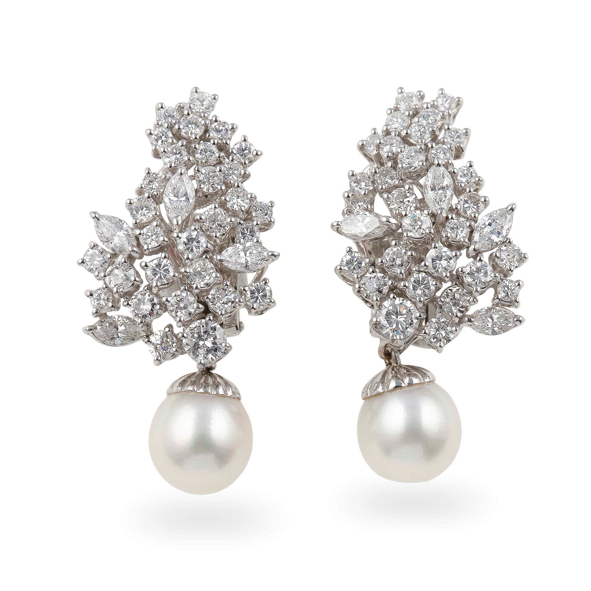 Orecchini pendenti con diamanti e perle coltivate, montatura in oro bianco 750/1000, gr. 17,0