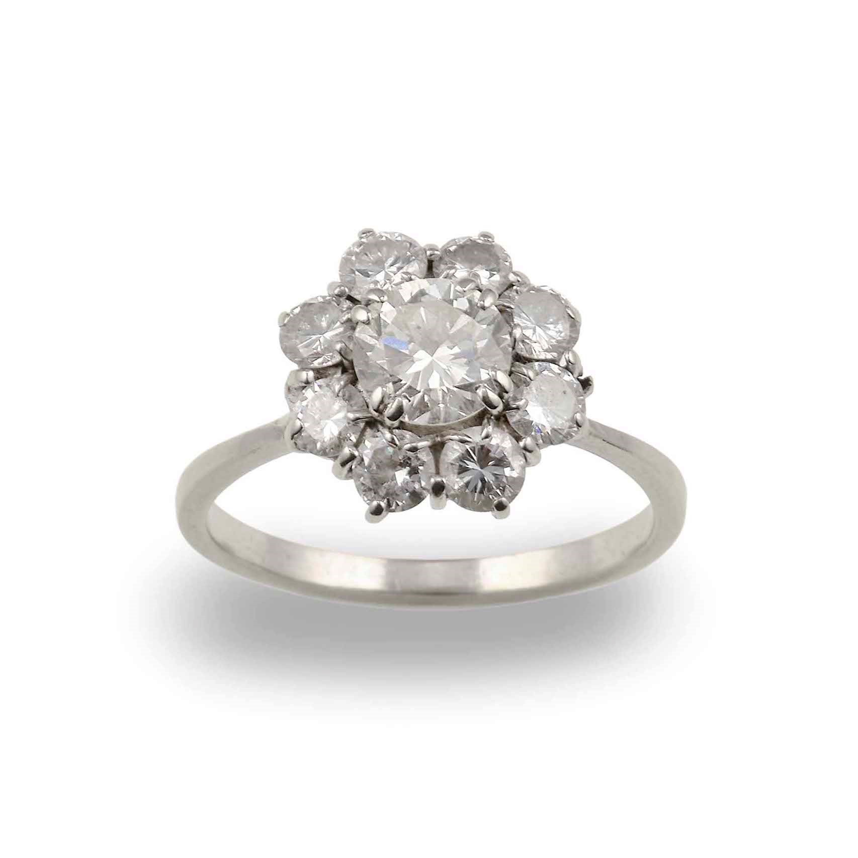 Anello a margherita con diamanti taglio brillante per ct 2.10 circa, montatura in oro bianco 750/1000, gr 3.6, misura italiana 16, diamante centrale ct 0.90 circa SI