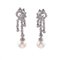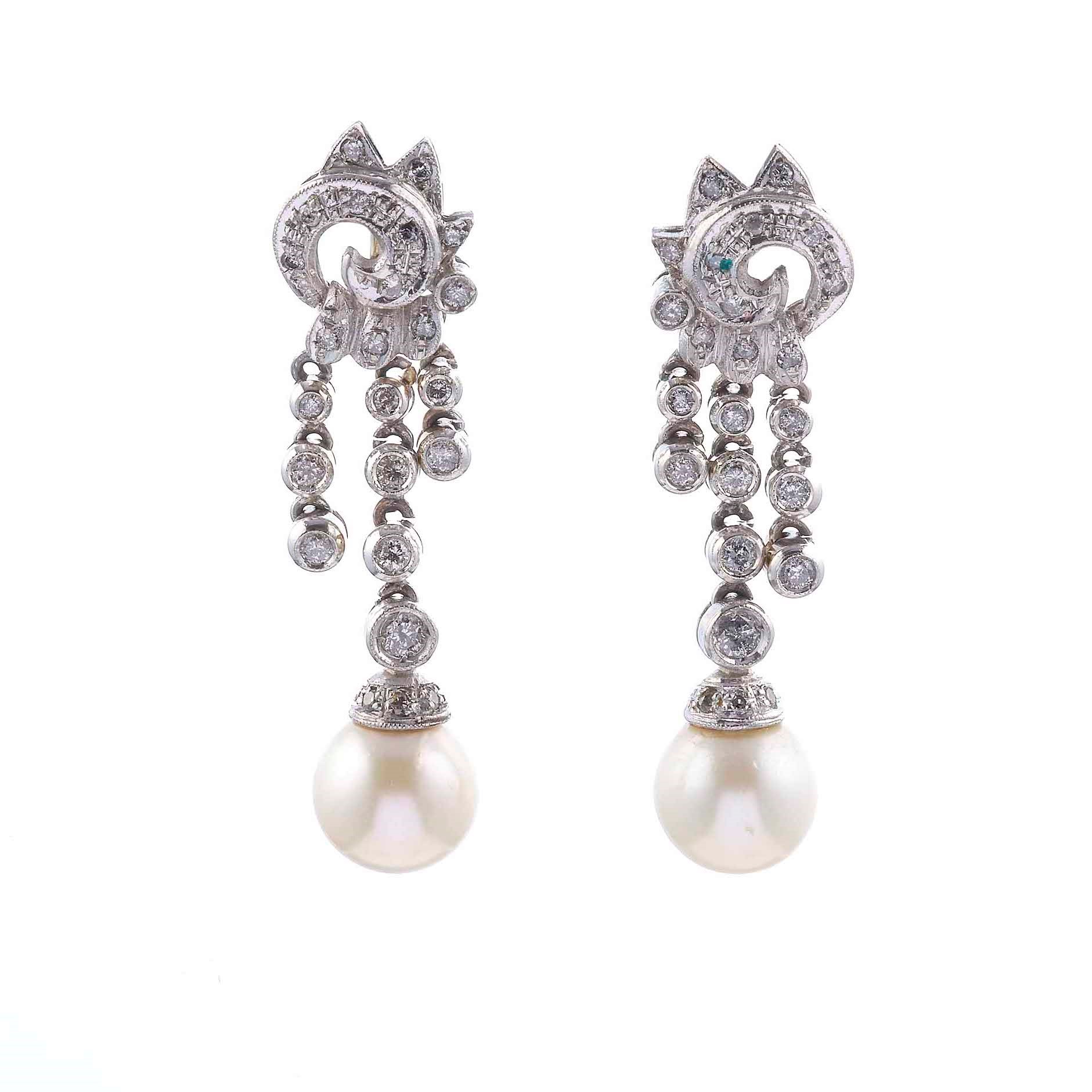Orecchini pendenti con perle coltivate e diamanti, montatura in oro bianco 750/1000, gr 10.6, cm 4.0