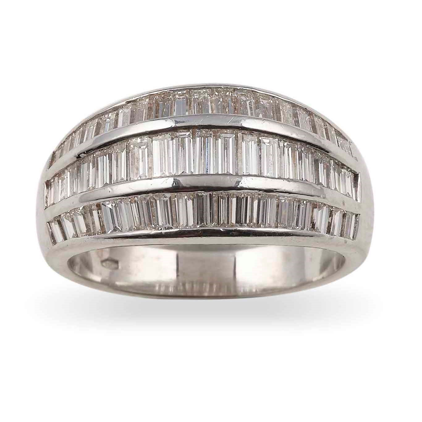 Anello con diamanti taglio baguette, montatura in oro bianco 750/1000, gr 7.6, misura italiana 15