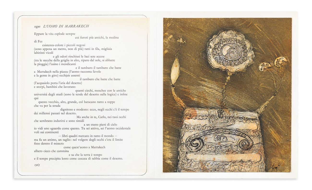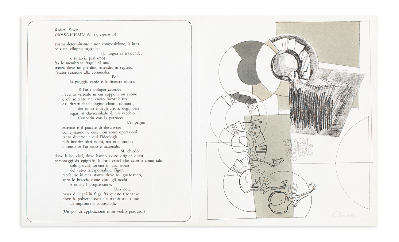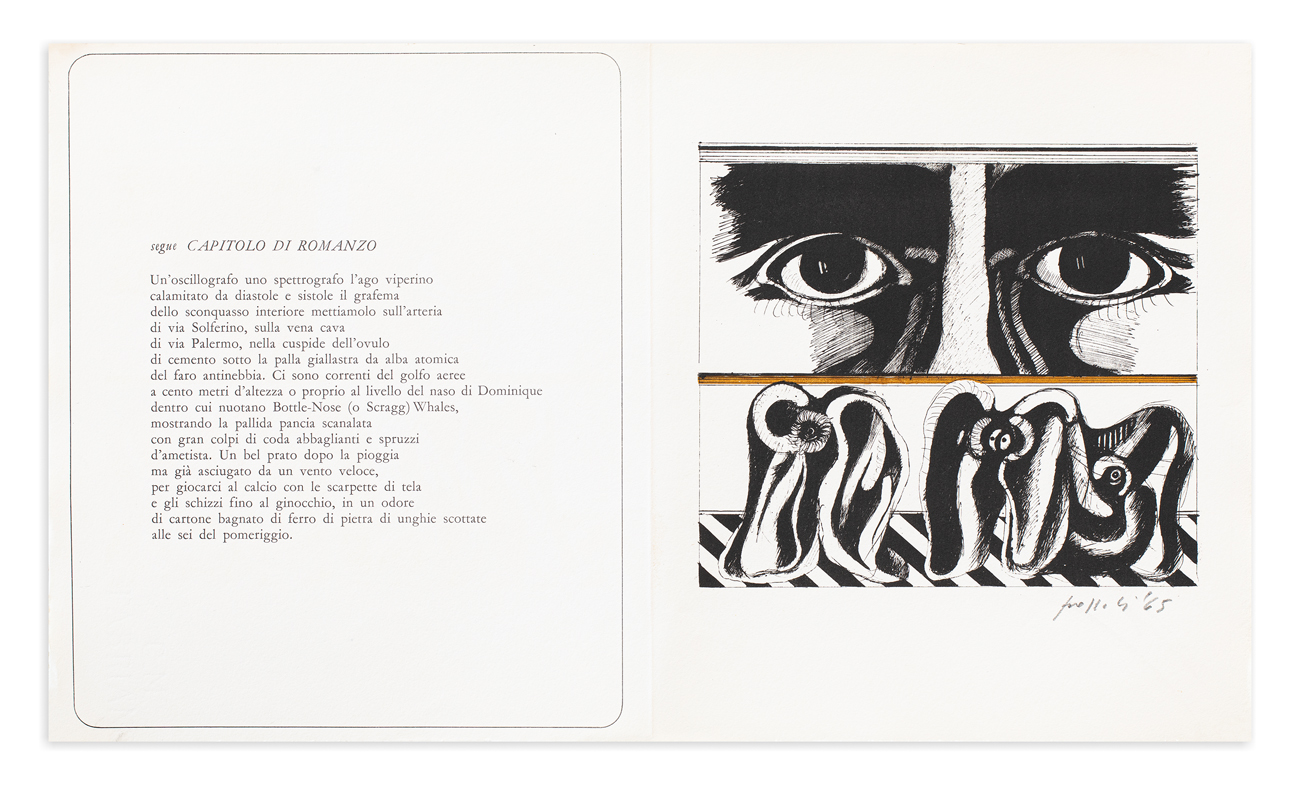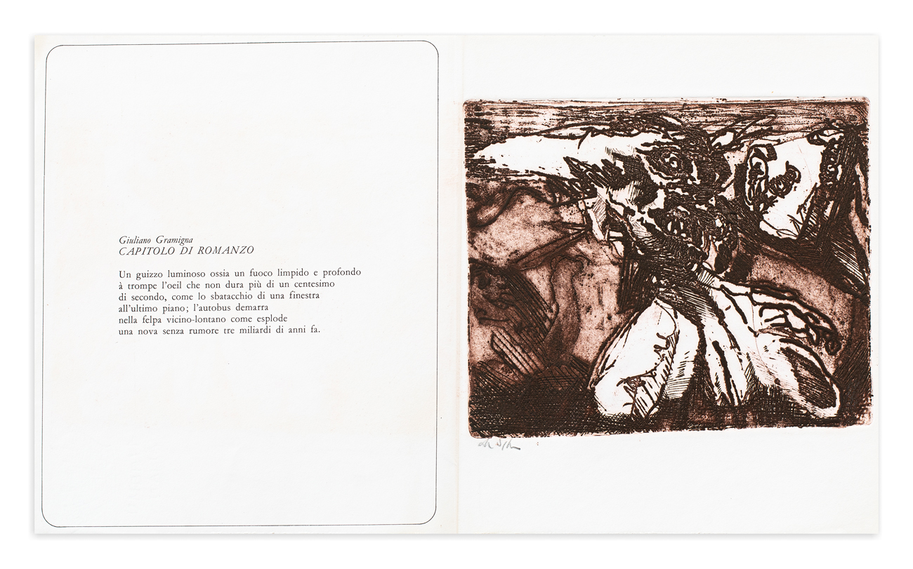 Cofanetto contente 15 litografie e acqueforti originali dei seguenti artisti: Kengiro Azuma, Giacomo Benevelli, Lucio Del Pezzo, Luciano De Vita, Hsiao Chin, Valerio Adami, Concetto Pozzati, Mario Schifano, Mario Rossello, Emilio Tadini, Renato Volpini, Enrico Baj, Emilio Scanavino, Rodolfo Aricò, Giò Pomodoro