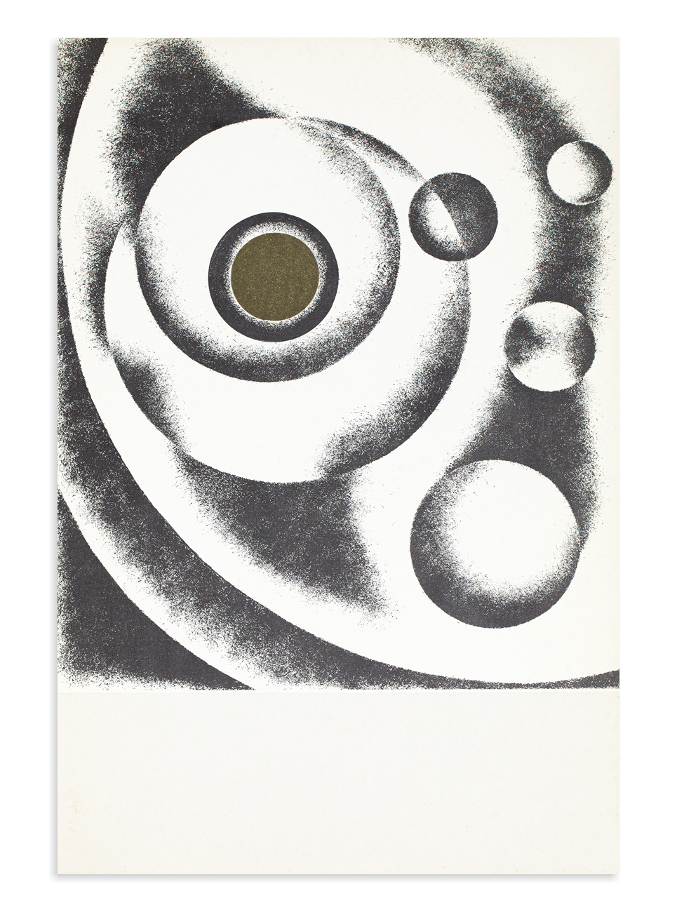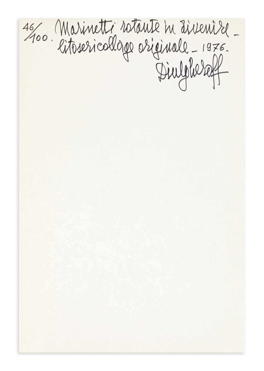 Fascicolo speciale de 'La Martinella di Milano', rilegato e riccamente illustrato, a cura di Carlo Belloli, contenente una lito-serigrafia e collage originale sciolta di Nikolas Diulgheroff, recante Firma, titolo (Marinetti rotante in divenire), tecnica, datazione e numerazione (Esemplare 46/100) a pennarello al retro