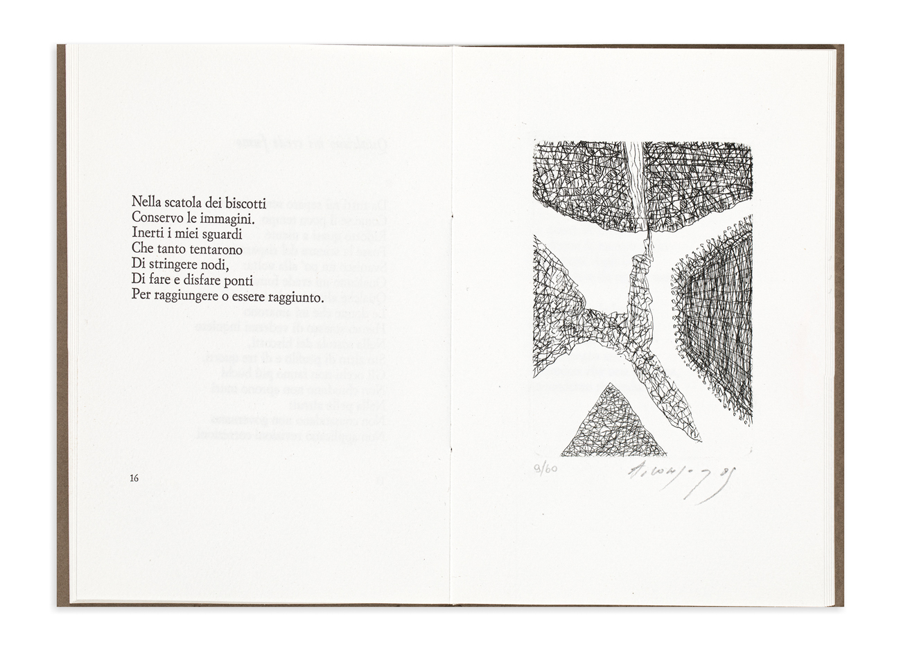 Edizione d'arte, a cura di Giorgio Lucini, con nota di Luigi Cavallo, poesie di Raffaele Carrieri e tre incisioni all'acquaforte di Alberto Longoni, ciascuna recante firma e numerazione (Esemplari 9/60) a matita al fronte