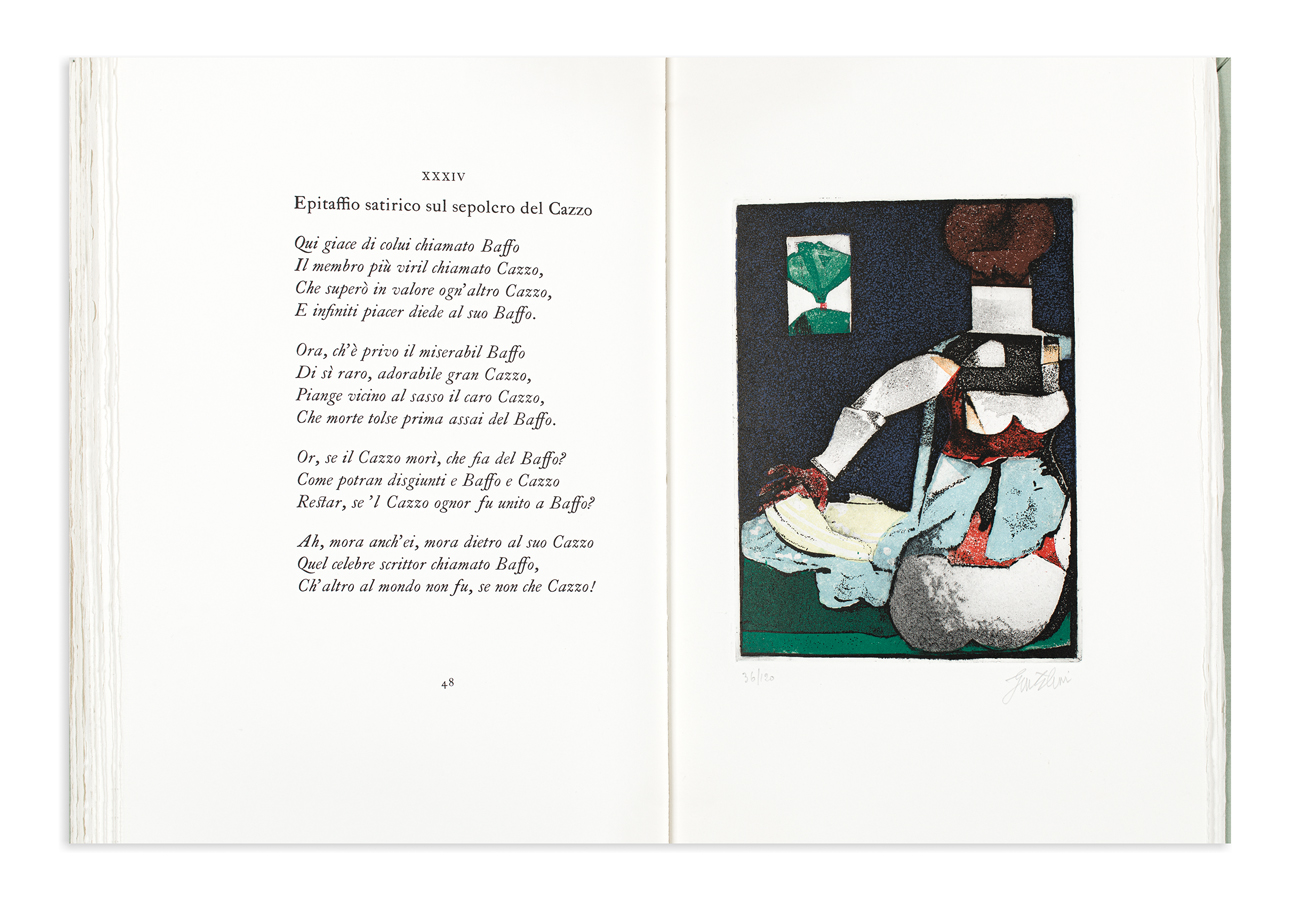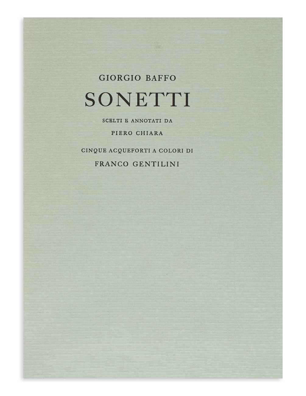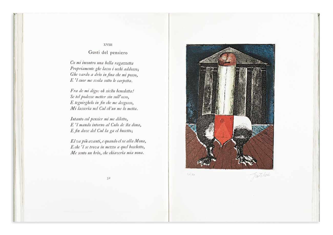 Edizione d'arte, realizzata su carta al Tino della Magnani, con sonetti di Giorgio Baffo scelti e annotati da Piero Chiara e 5 acqueforti originali a colori di Franco Gentilini, ciascuna recante firma e numerazione (Esemplari 36/120) a matita al fronte