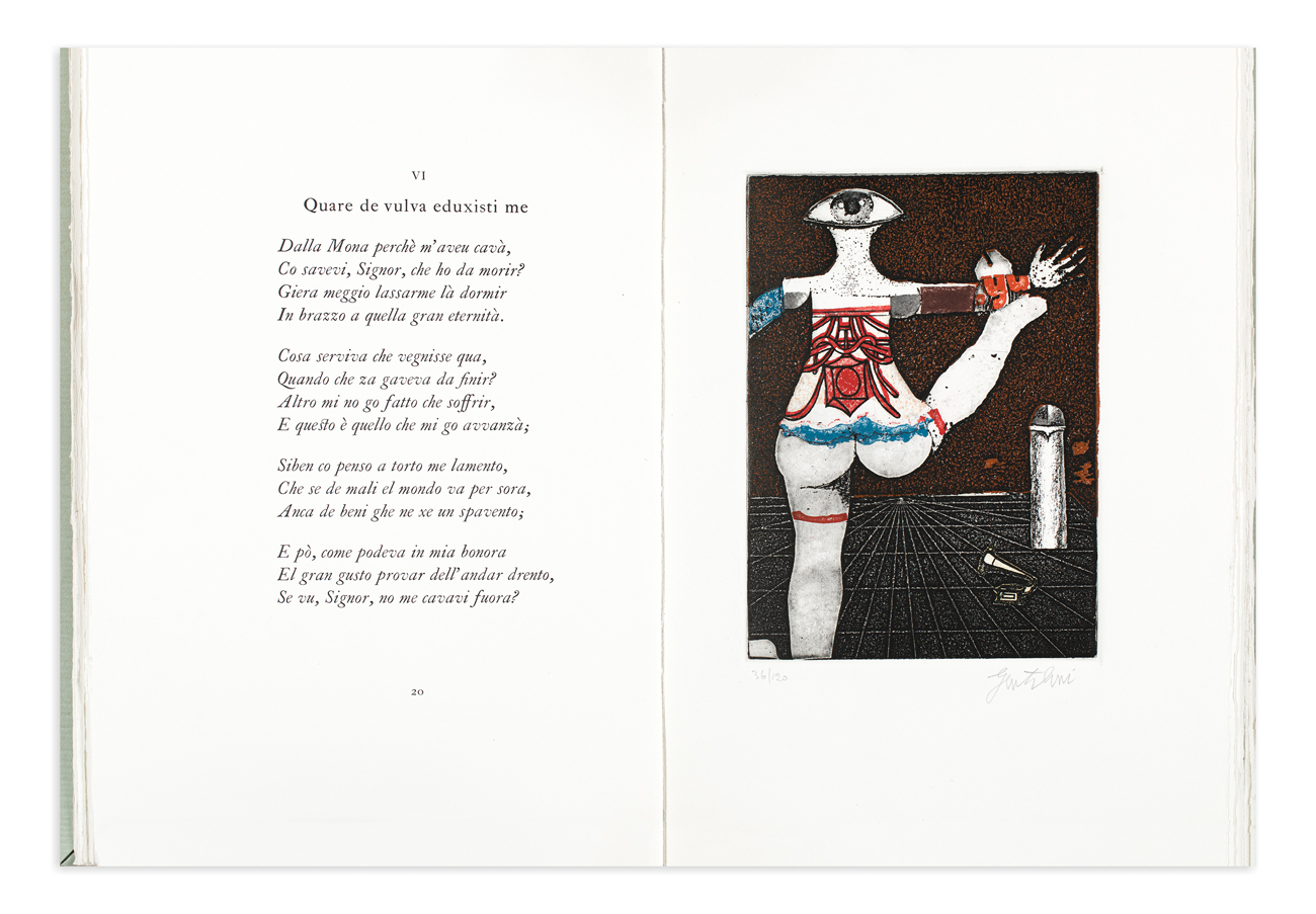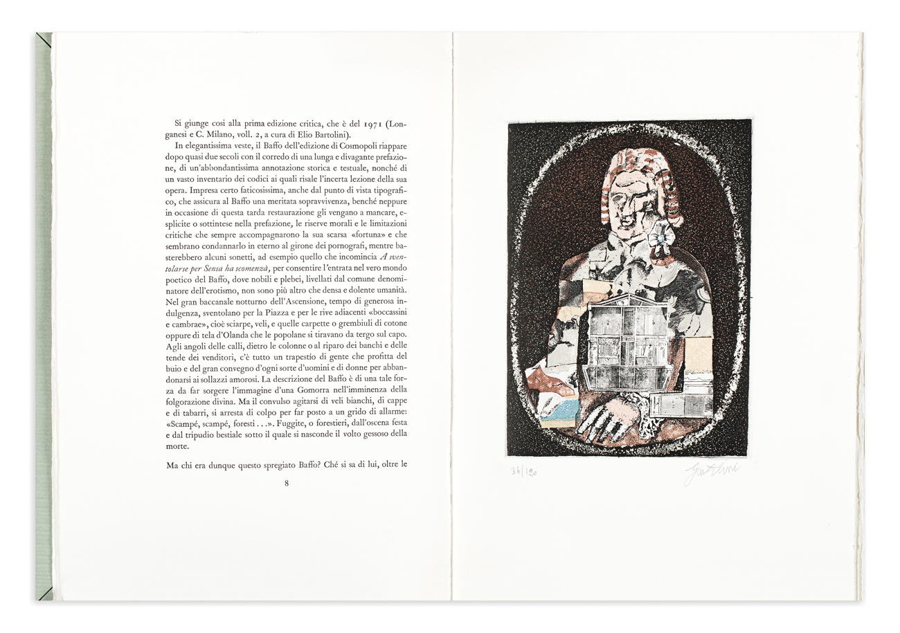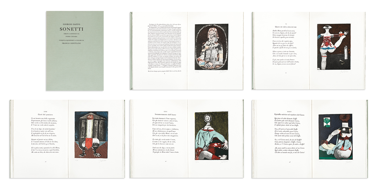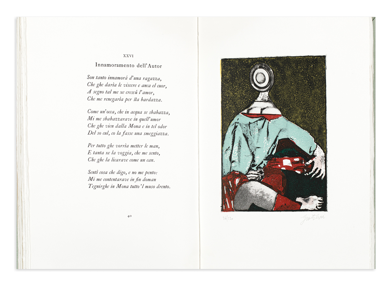 Edizione d'arte, realizzata su carta al Tino della Magnani, con sonetti di Giorgio Baffo scelti e annotati da Piero Chiara e 5 acqueforti originali a colori di Franco Gentilini, ciascuna recante firma e numerazione (Esemplari 36/120) a matita al fronte