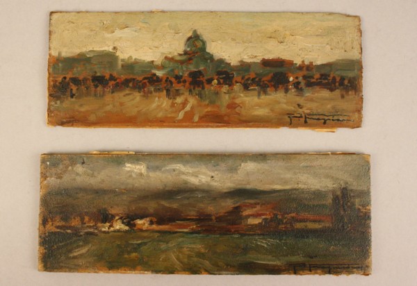 FRAGIACOMO PIETRO - Nato a Trieste nel 1856. Morto a Venezia nel 1922. Coppia di piccoli dipinti olio su tavoletta raff. ''PAESAGGI''. Firmati in basso a destra. Mis. Lung. cm. 20 Alt. cm. 7 ca.