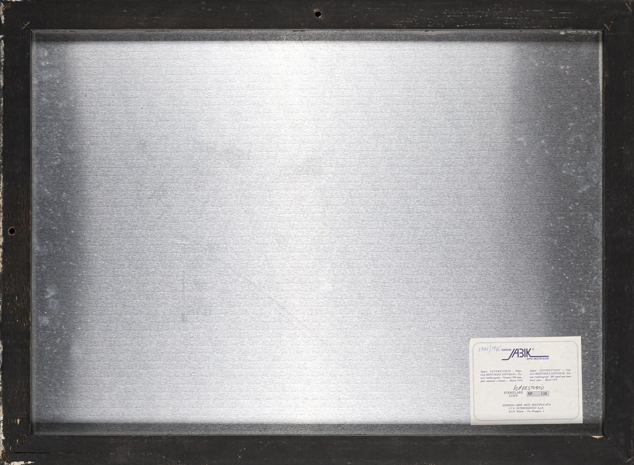 Etichetta delle Edizioni Jabik Arte Moltiplicata (MI) al retro con indicazioni dell'edizione, firma e numerazione (Esemplare 136/500)