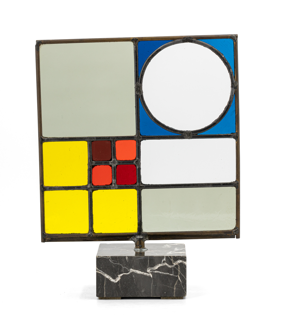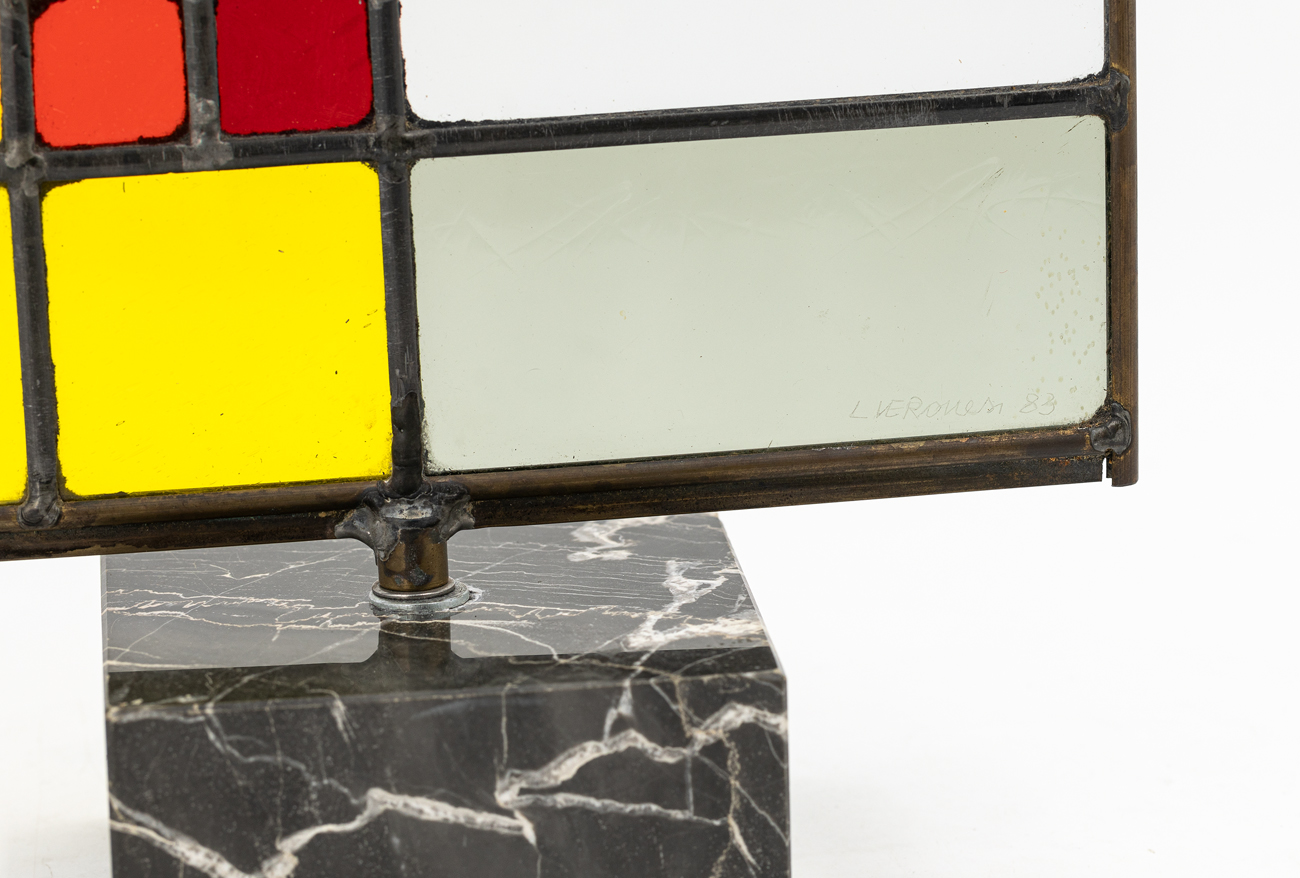 Scultura in vetro di S. Just soffiato con frazionatura manuale e legatura a piombo applicata su base in marmo