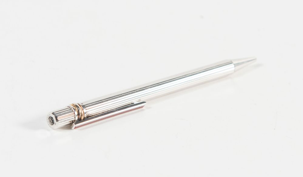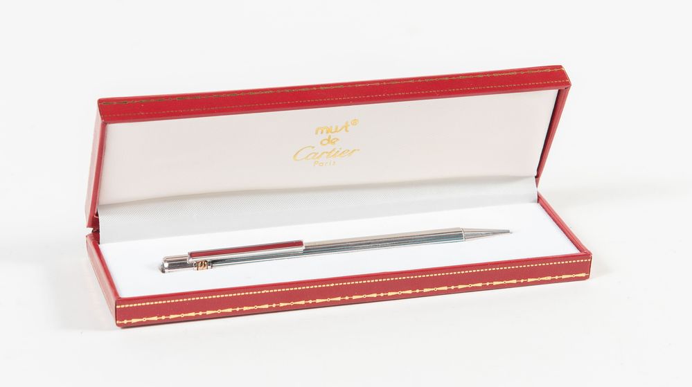 MUST DE CARTIER Penna a sfera in argento godron con clip in smalto bordeaux modello Trinity. Corredata di scatola originale. (Difetti, necessita di revisione)