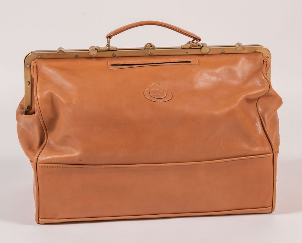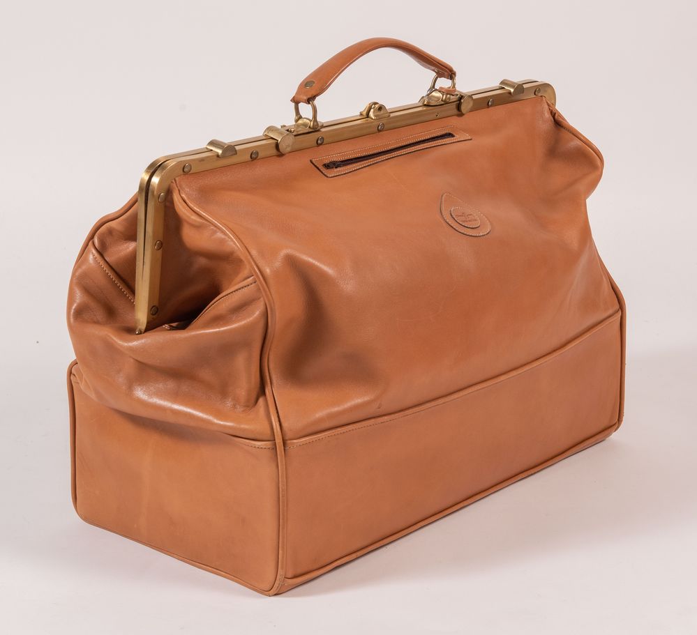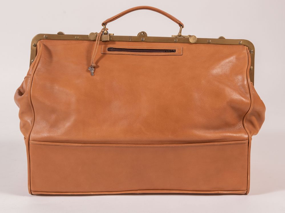 DANIEL AND BOB Borsone da viaggio in pelle con rifiniture in metallo dorato satinato. Cm 55x58x29. Su entrambi i lati esterni presenta una tasca chiusa da cerniera. Interno rifinito in pelle con una tasca chiusa da cerniera. Reca marchio Daniel and Bob. (Difetti)