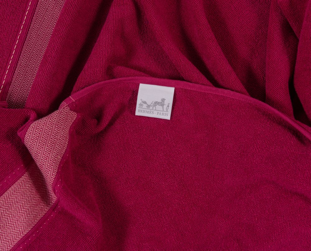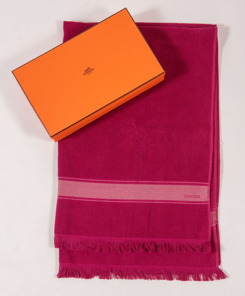 HERMÈS Grande telo in spugna color malva. Cm 147x93. Composizione: 100% cotone. Reca marchio Hermès ed etichetta Hermès Paris Made in Belgium. Corredata di scatola originale.