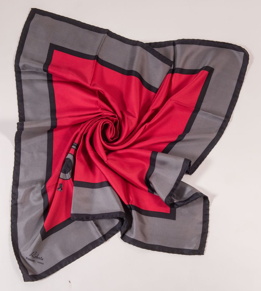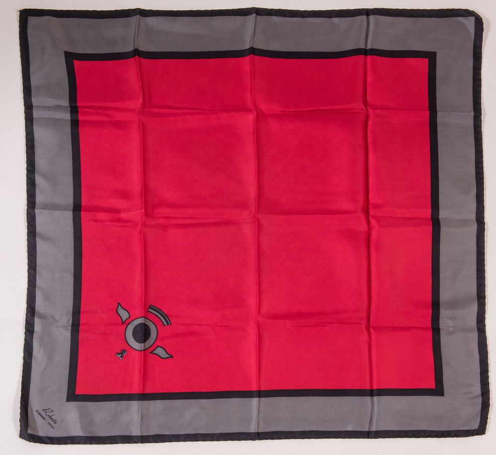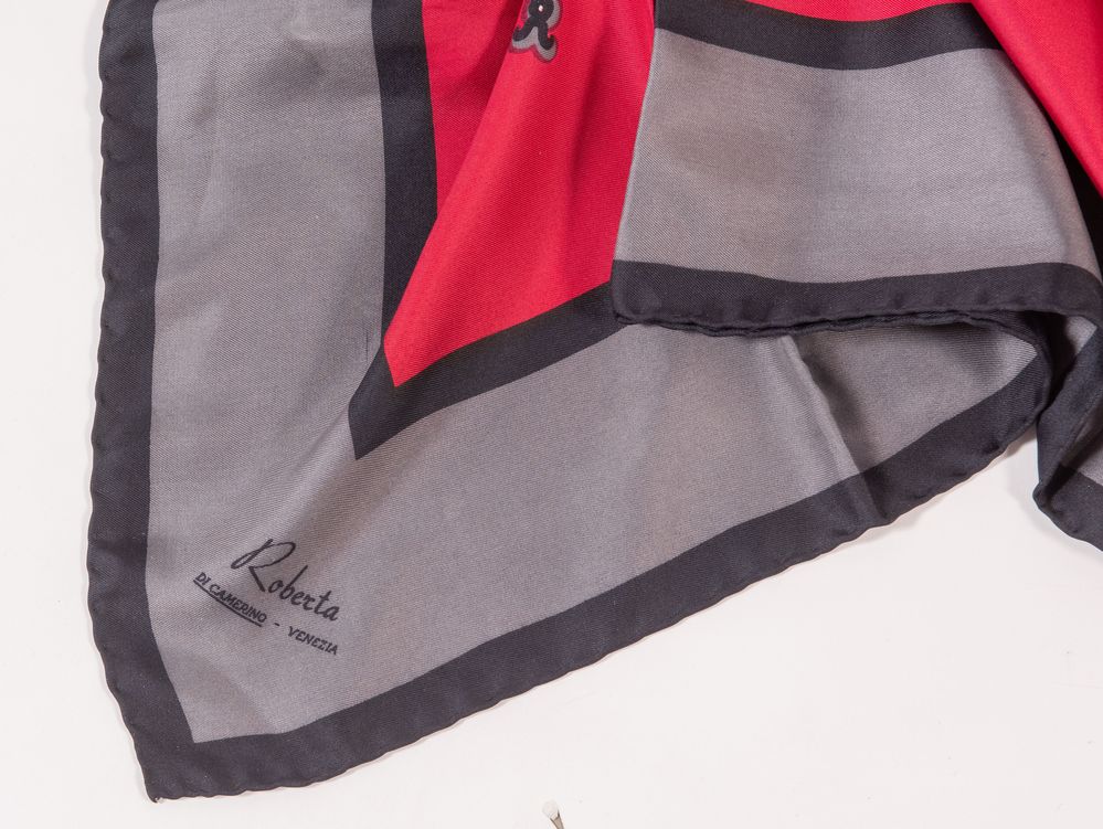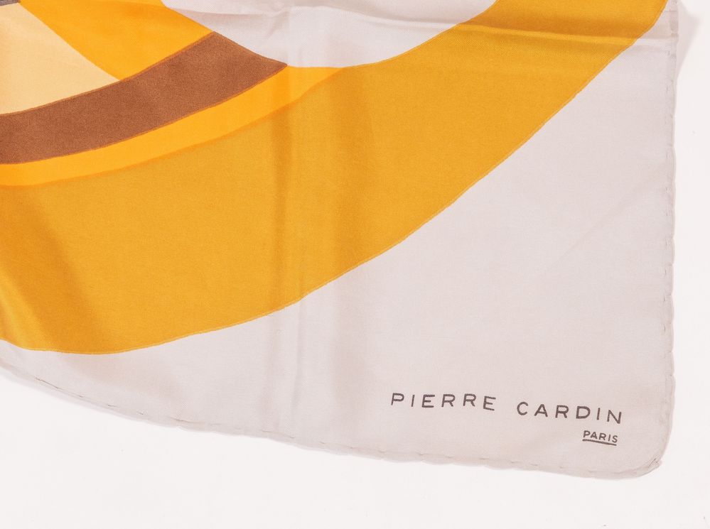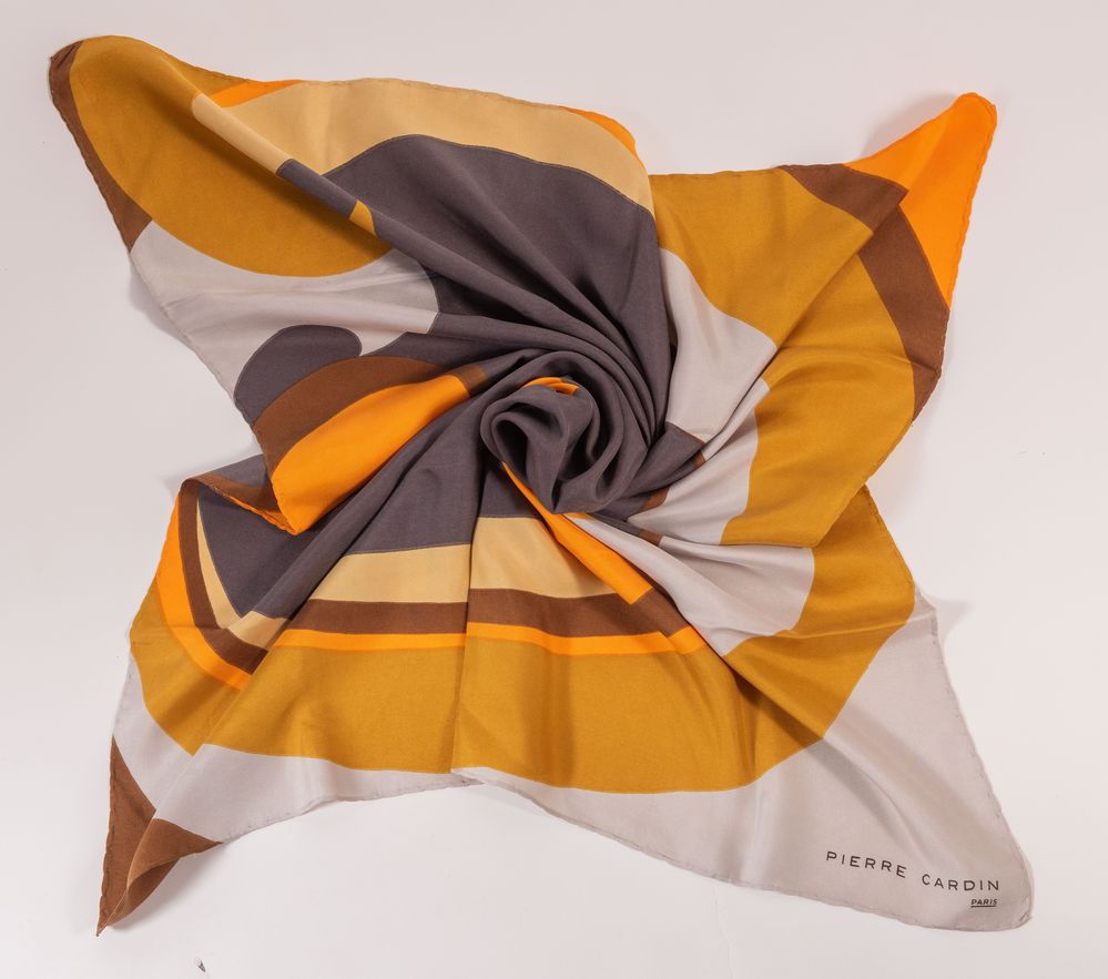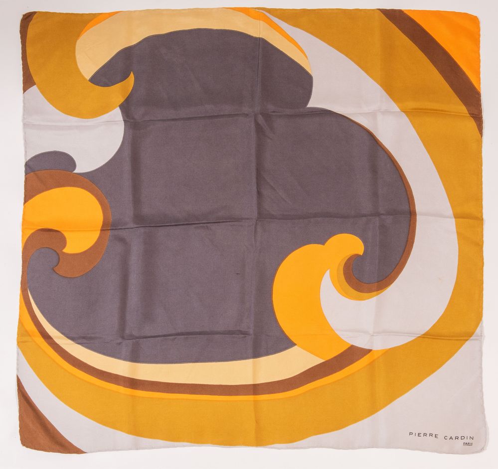 ROBERTA DI CAMERINO, PIERRE CARDIN Lotto composto da due foulard in seta di diverso colore e fantasia. Rispettivamente di misure: cm 86x86; cm 76x76. Recano firme Roberta di Camerino - Venezia e Pierre Cardin Paris. (Lievi difetti)