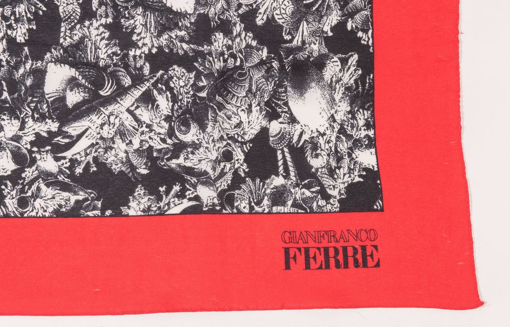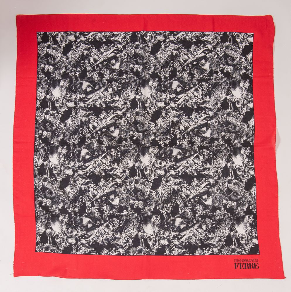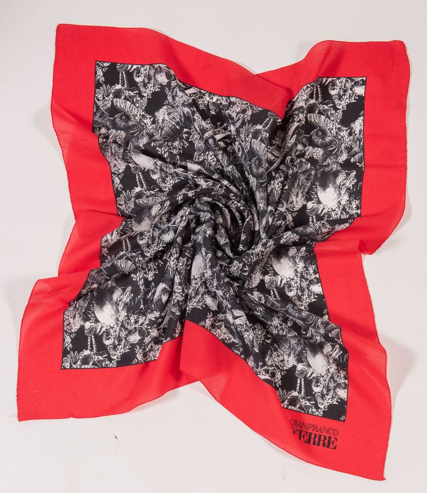 GIANFRANCO FERRÈ Foulard con motivo marino di conchiglie sui toni del bianco, nero e rosso. Cm 82x86. Composizione: 100% poliestere. Reca firma Gianfranco Ferrè. (Difetti)