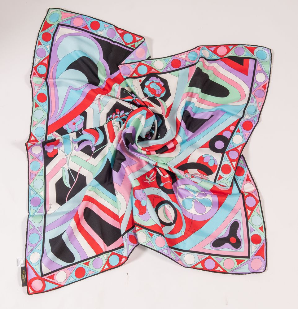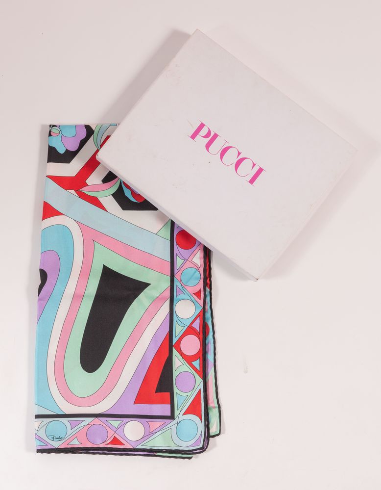 EMILIO PUCCI Foulard in seta con motivo geometrico multicolore. Cm 86x86. Reca etichetta Emilio Pucci Firenze. Composizione 100% seta. Corredato di scatola originale. (Lievi difetti)