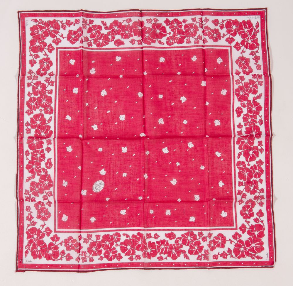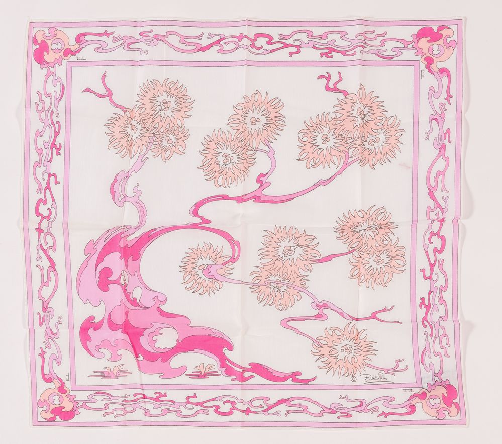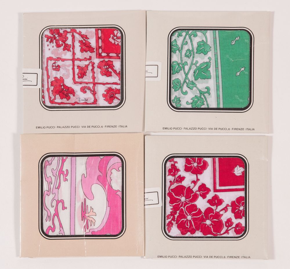 EMILIO PUCCI Lotto composto da quattro fazzoletti in cotone sui toni del rosso e del rosa. Cm 42x42 cad. Composizione: 100% cotone. Ciascuno reca firma Emilio. Corredati di confezione originale.