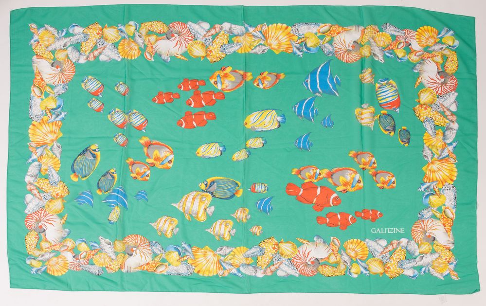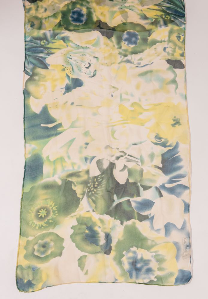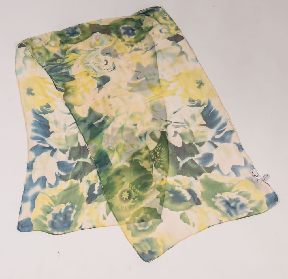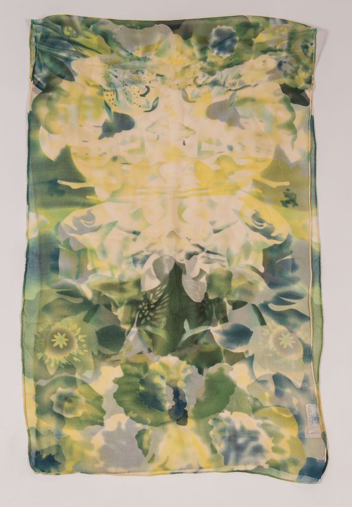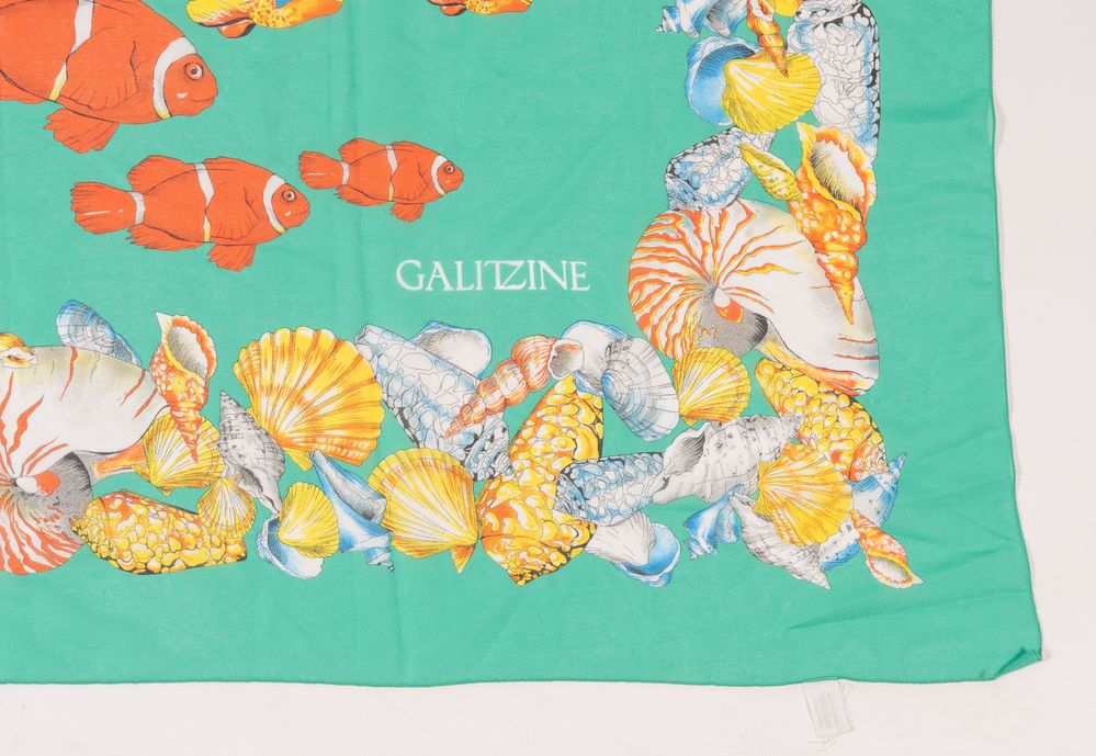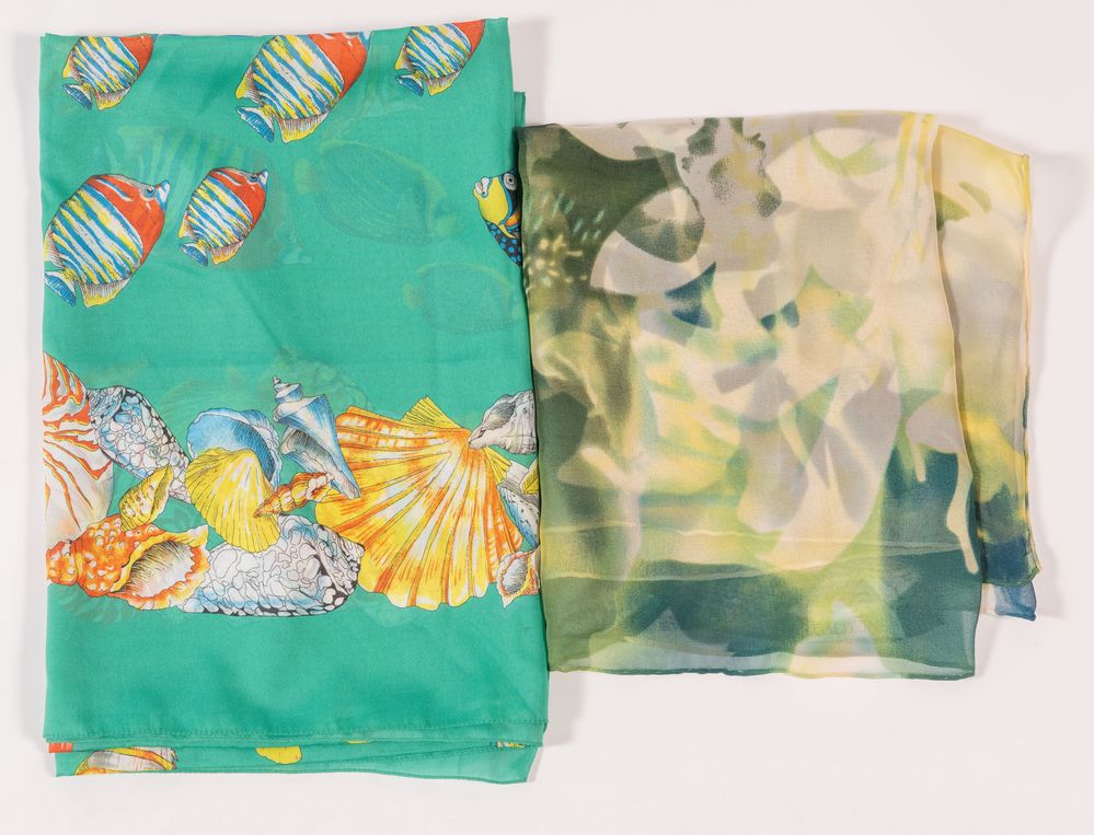 GALITZINE Lotto composto da due foulard con motivi sui toni del verde. Rispettivamente di misure: cm 103x156, Cm 173x51,5. Composizioni: crepe de chine, 100% seta. Uno reca firma Galitzine ed etichetta Made in Italy, l'altro reca etichetta Galitzine. (Lievi difetti)