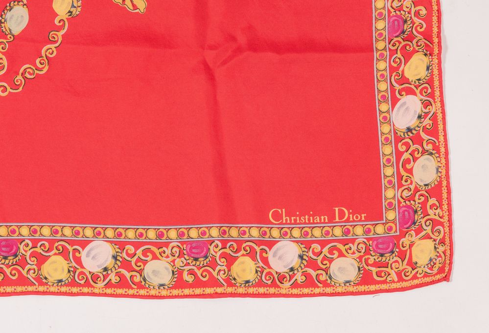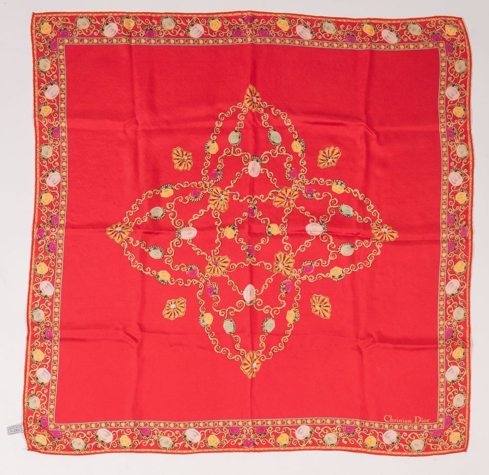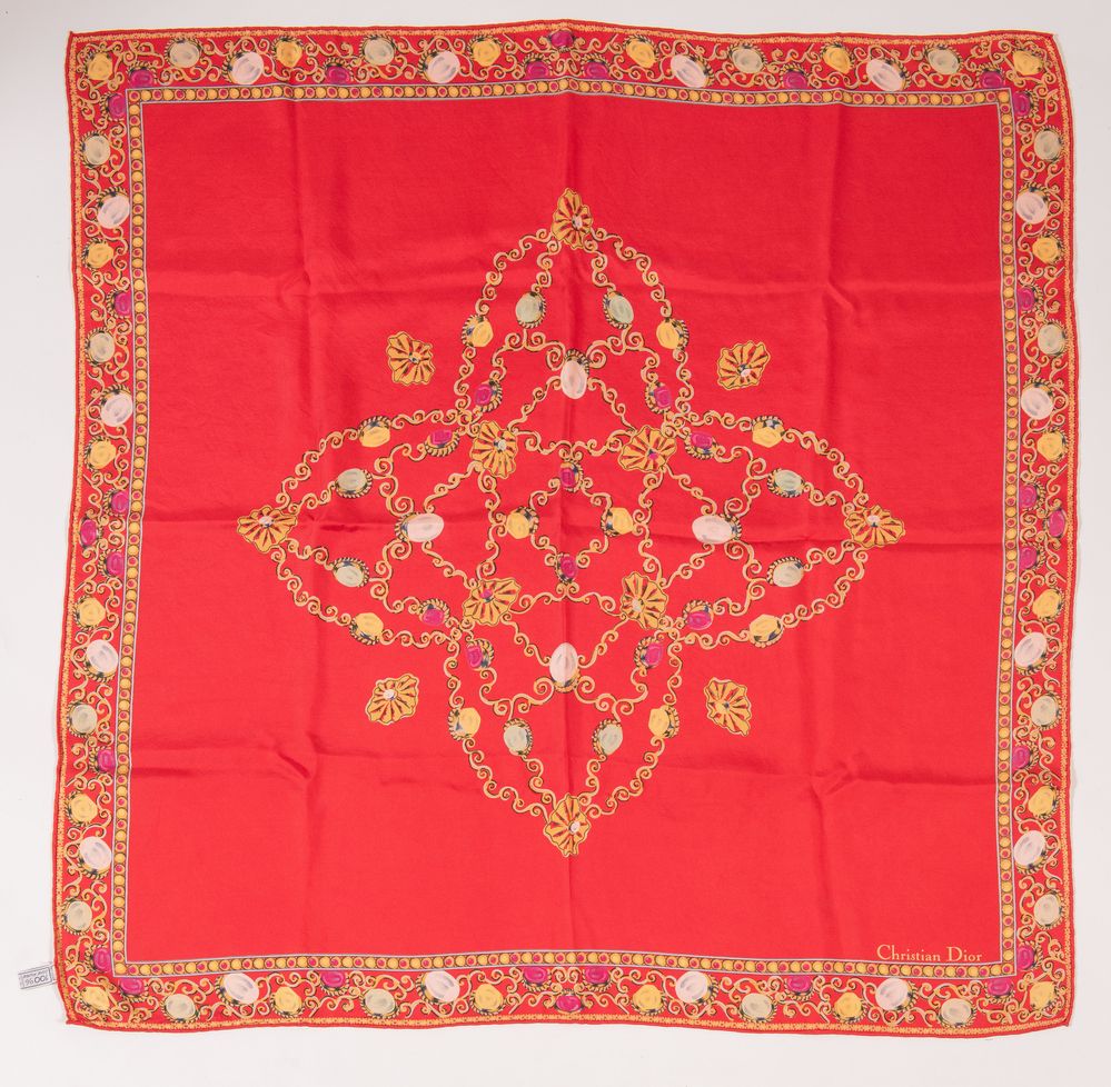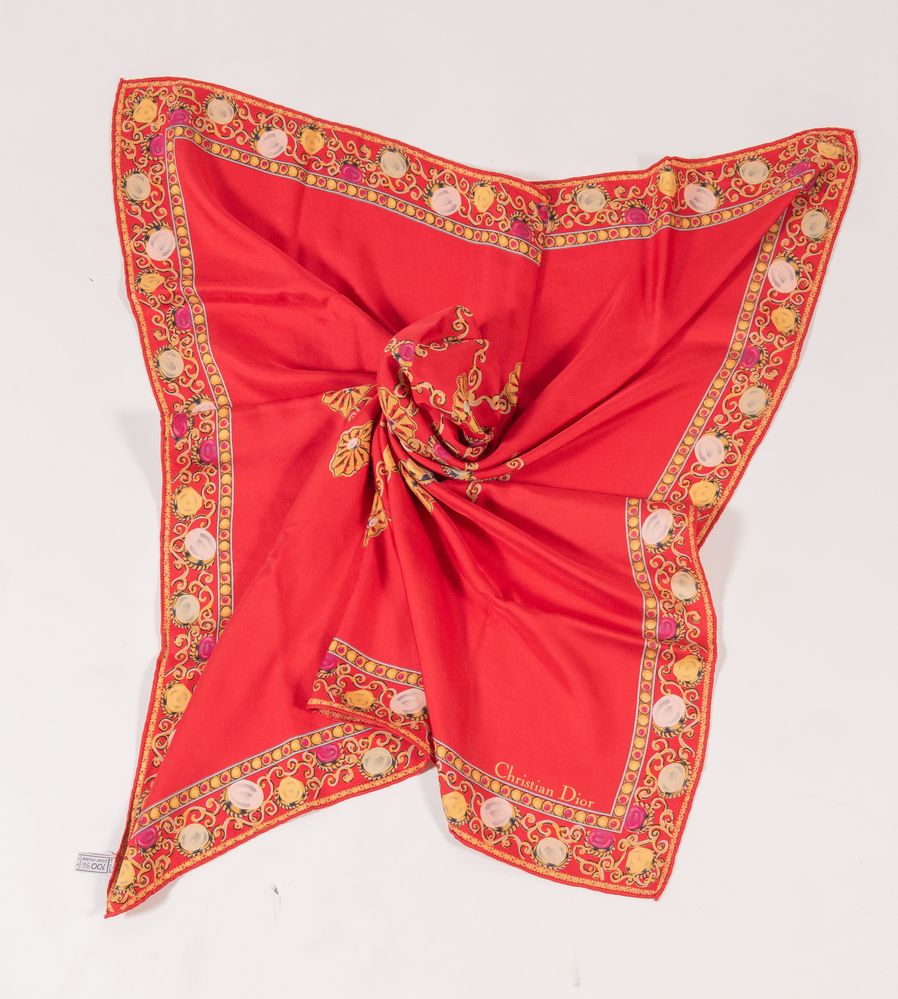 CHRISTIAN DIOR Foulard in seta sui toni del rosso. Cm 83x86. Composizione:...