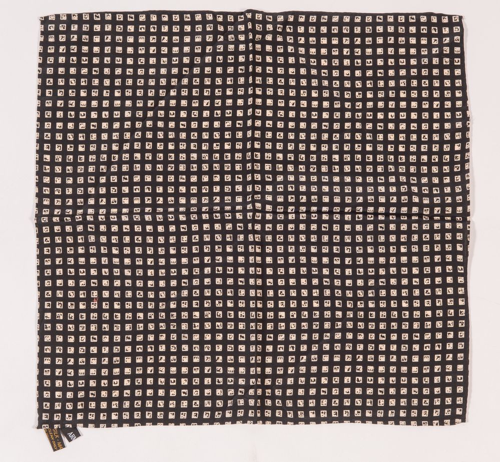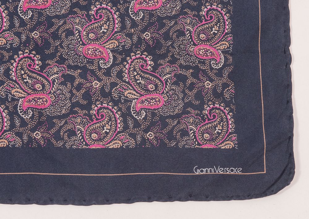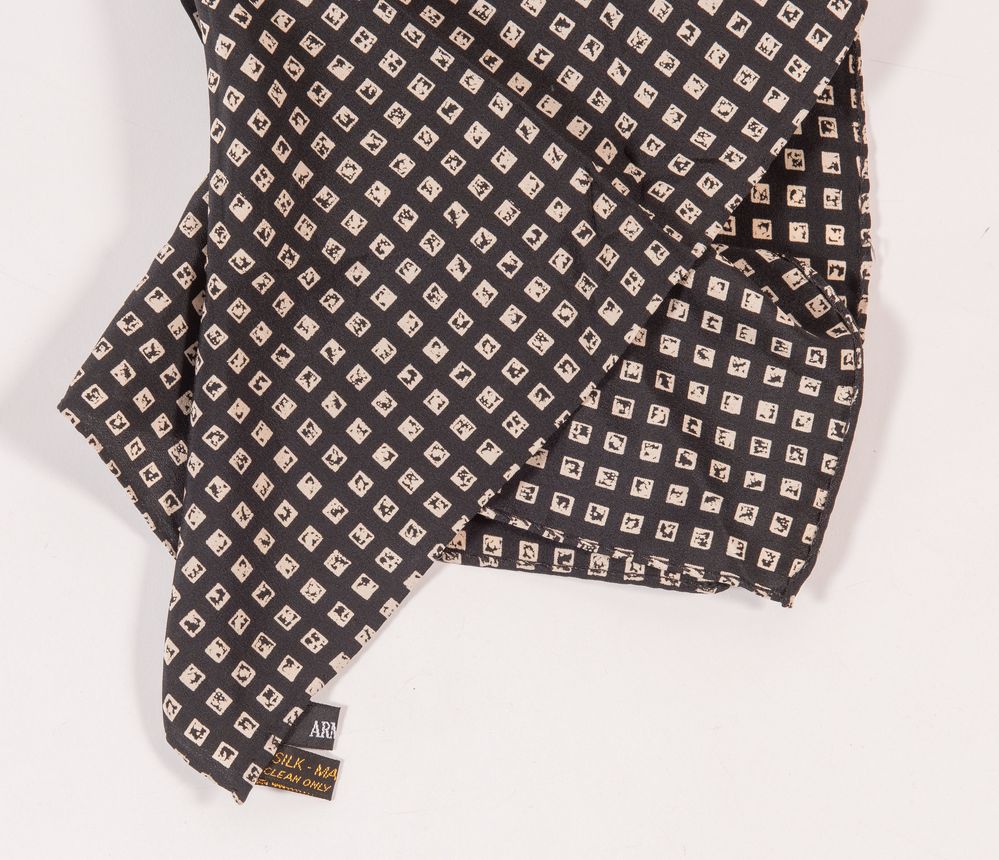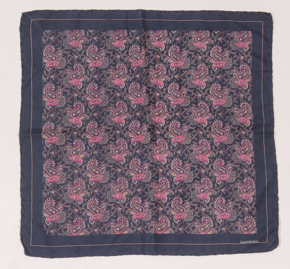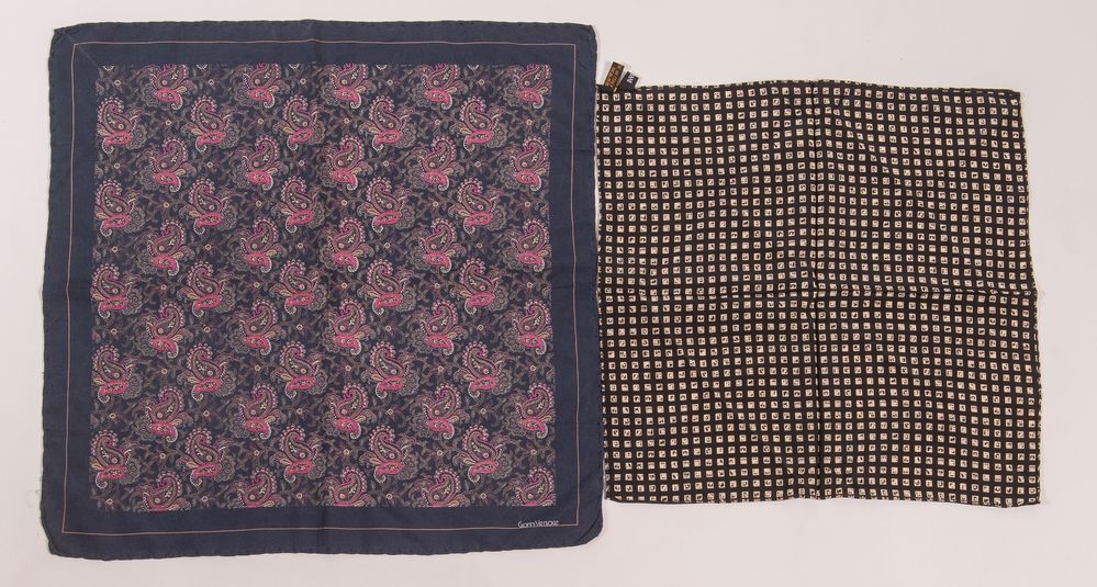 GIANNI VERSACE, GIORGIO ARMANI Lotto composto da due fazzoletti in seta sui toni del nero e del blu. Rispettivamente di misure: cm 46x46, cm 36x36. Recano etichetta Giorgio Armani e firma Gianni Versace. (Lievi difetti)
