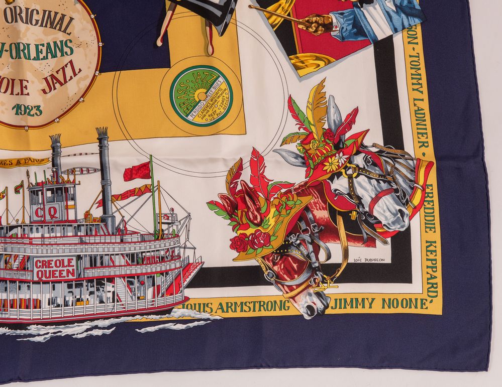 HERMÈS Foulard in seta "The original New-Orleans Creole Jazz 1923" by Loic Dubigeon, 1996. Cm: 86x89. Composizione: 100% seta. Reca firma Loìc Dubigeon. (Lievi difetti)