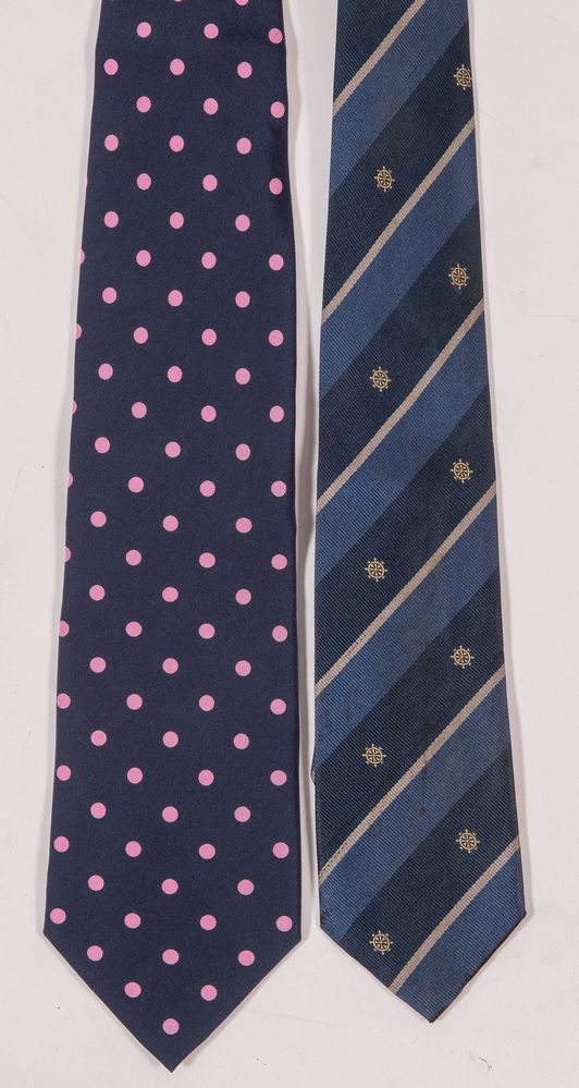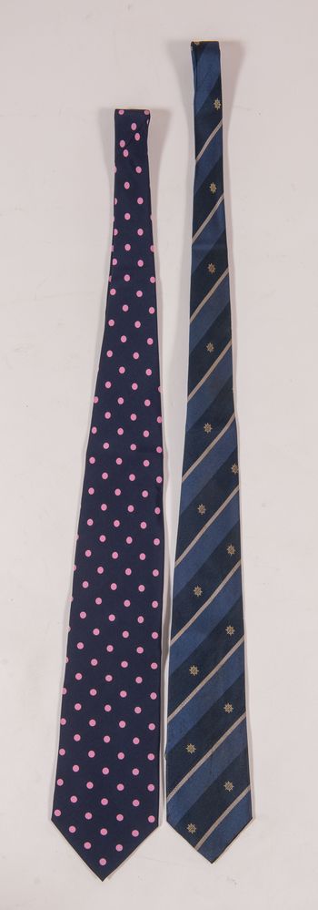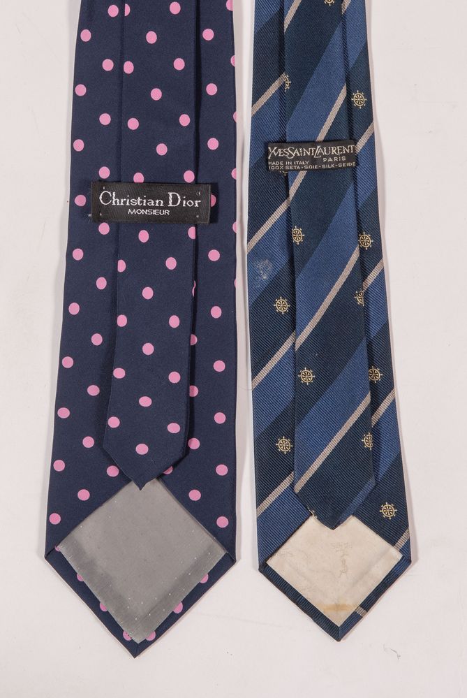 CHRISTIAN DIOR, YVES SAINT LAURENT Lotto composto da due cravatte in seta con fantasia a pois. Lunghezza totale: cm 143 cad. Composizione 100% seta. Recano etichette Christian Dior Monsieur e Yves Saint Laurent Made in Italy. (Difetti)