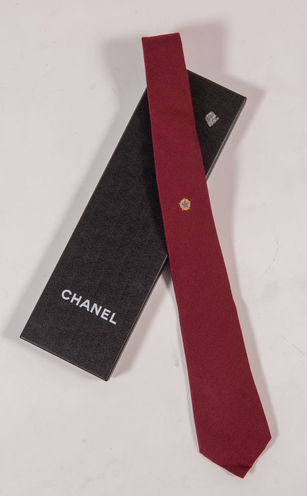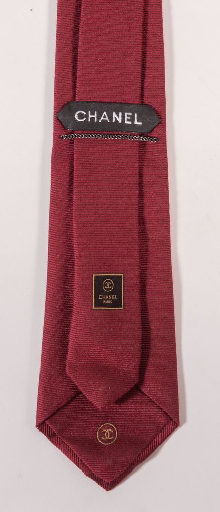 CHANEL Cravatta in seta e lana bordeaux con catenella in metallo sul retro. Cm 145x8. Composizione: 78% seta, 22% lana vergine. Reca marchi CC, Chanel e Chanel Paris. Corredata di scatola originale. (Lievi difetti)