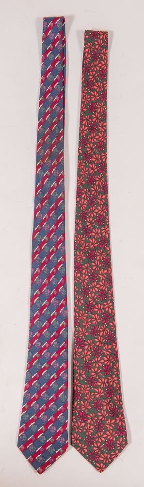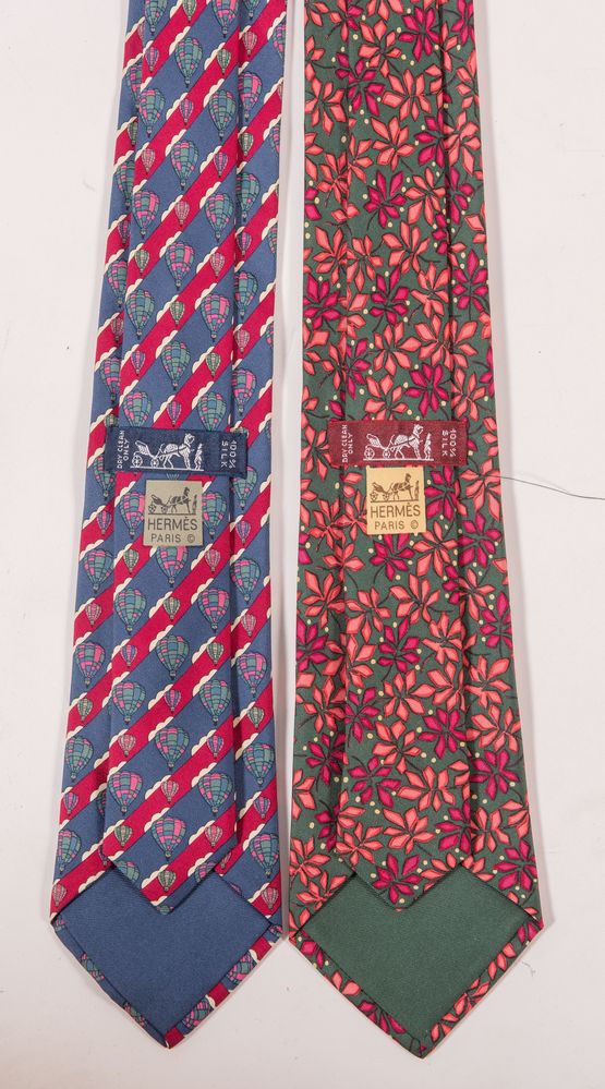 HERMÈS Lotto composto da due cravatte cravatte di diverso colore e fantasia. Rispettivamente di lunghezza totale: cm 140; cm 142. Composizione 100% seta. Recano marchi Hermès Paris