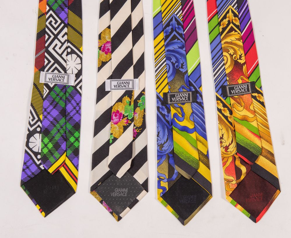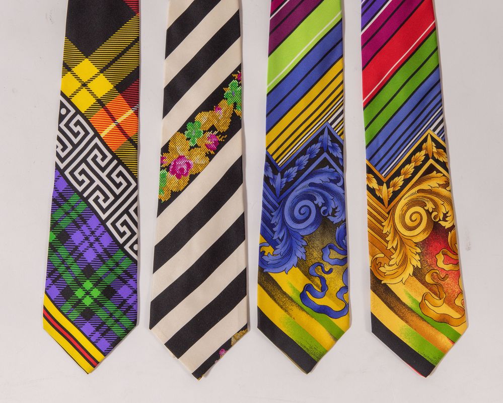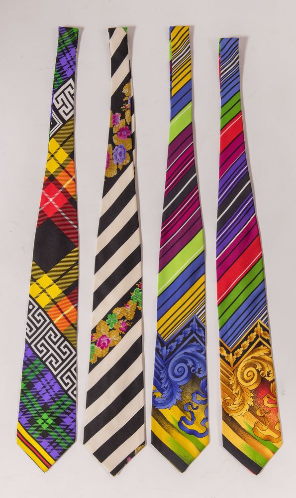 GIANNI VERSACE Lotto composto da quattro cravatte in seta di diversi colori e fantasie. Cm 140/145 ca. cad. Composizioni: 100% seta. Recano etichette e marchi Gianni Versace.