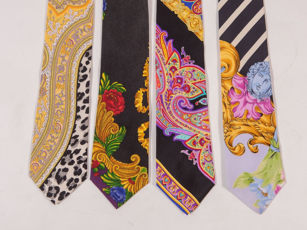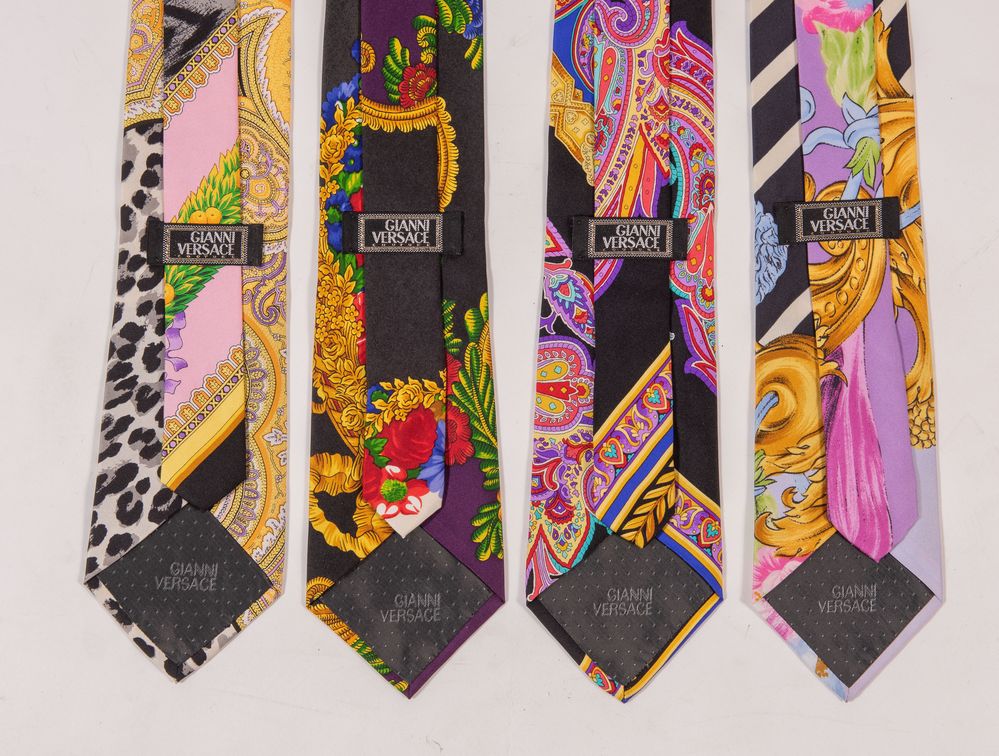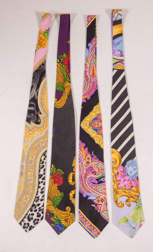 GIANNI VERSACE Lotto composto da quattro cravatte in seta di diversi colori e fantasie. Cm 140/145 ca. cad. Composizioni: 100% seta. Recano etichette e marchi Gianni Versace.