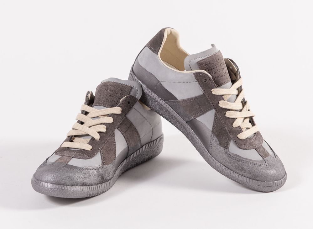 MAISON MARGIELA Sneakers modello Replica in pelle e tessuto scamosciato sui toni del grigio. Riportano taglia 36.5. Corredate di scatola originale con dettagli e specifiche del prodotto e sacchetti protettivi in cotone.