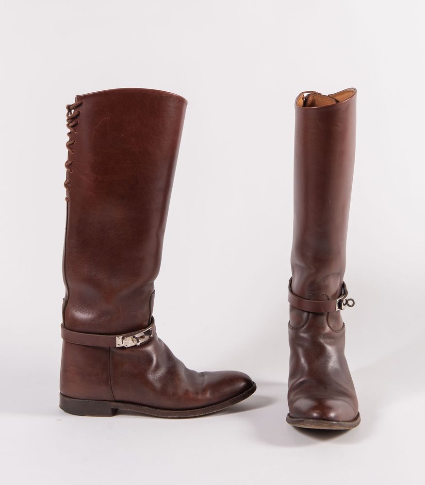 HERMÈS Stivali alti in pelle marrone con dettagli in metallo argentato. Taglia non leggibile: 39 circa. Recano marchi Hermès, semelle cuir Made in Italy. Corredati di dustbag e scatola originali. (Segni di usura)