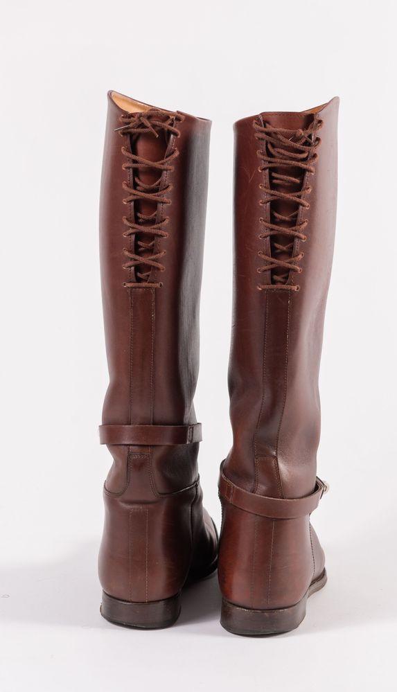 HERMÈS Stivali alti in pelle marrone con dettagli in metallo argentato....