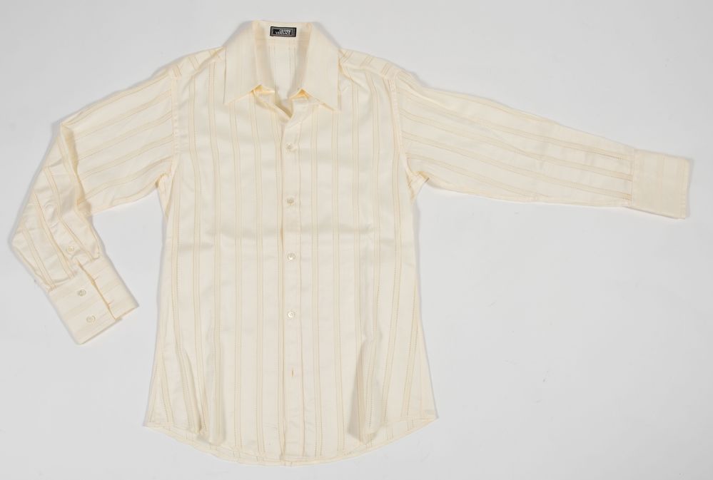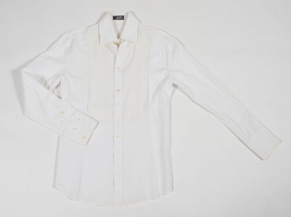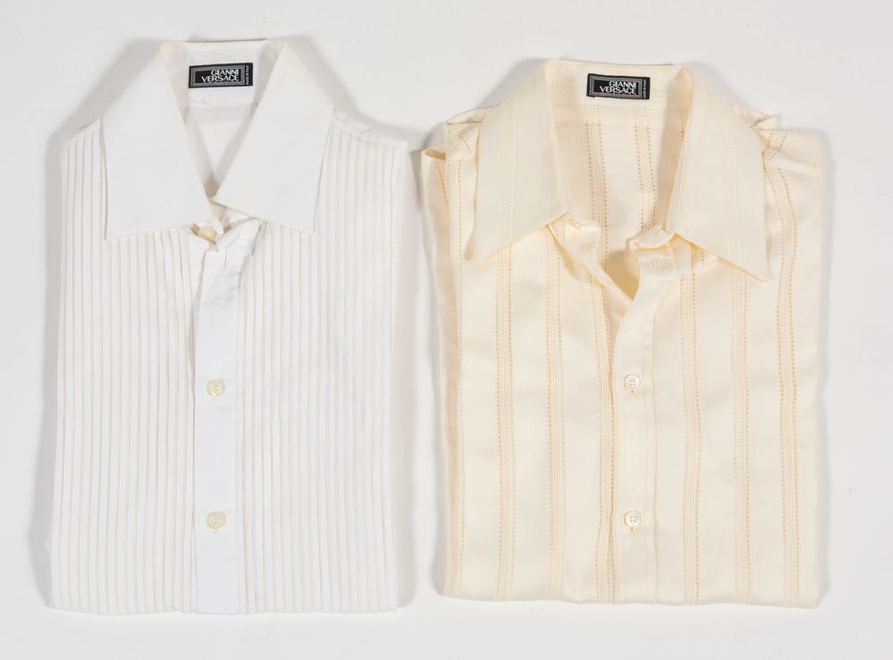 GIANNI VERSACE Lotto composto da due camicie in cotone lavorato sui toni del bianco e del panna. Riportano taglia 46. Ciascuna reca etichetta Gianni Versace. (Lievi difetti)