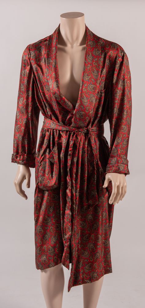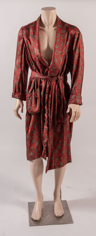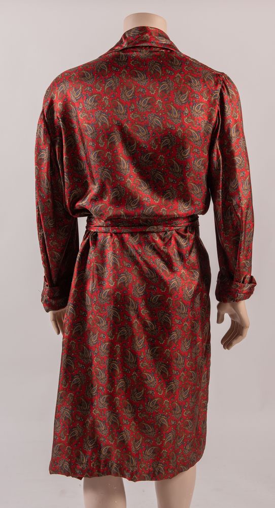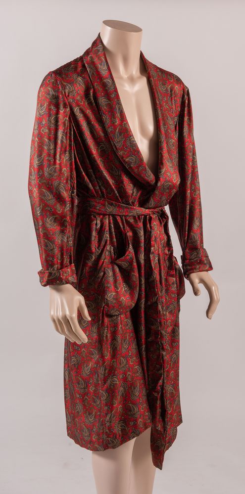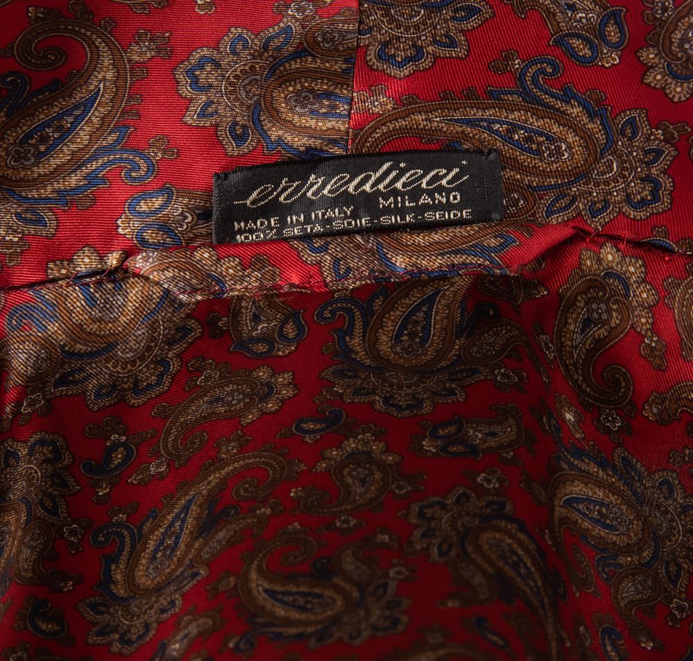 ERREDIECI Vestaglia in seta con cintura con motivo cachemire sui toni del rosso. Taglia unica. Composizione: 100% seta. Reca etichetta Erredieci Milano Made in Italy.