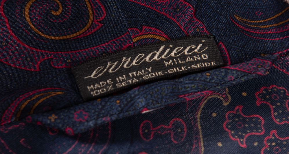 ERREDIECI Vestaglia in seta con cintura con motivo cachemire sui toni del blu. Taglia unica. Composizione: 100% seta. Reca etichetta Erredieci Milano Made in Italy.