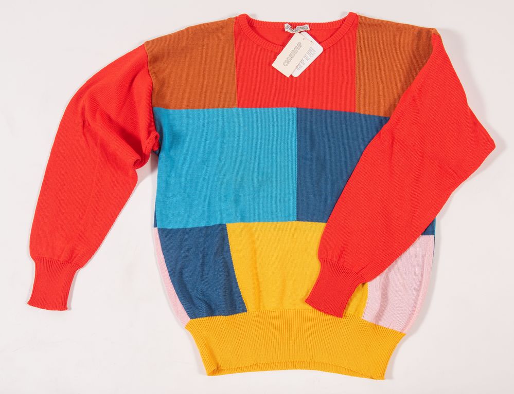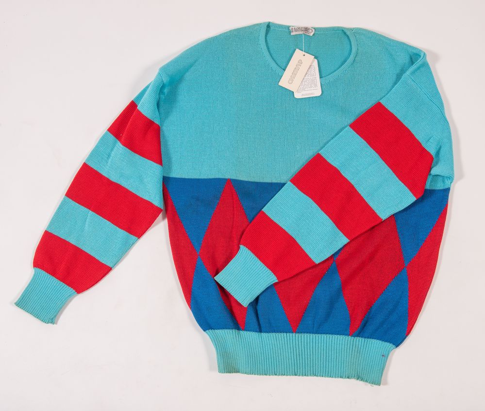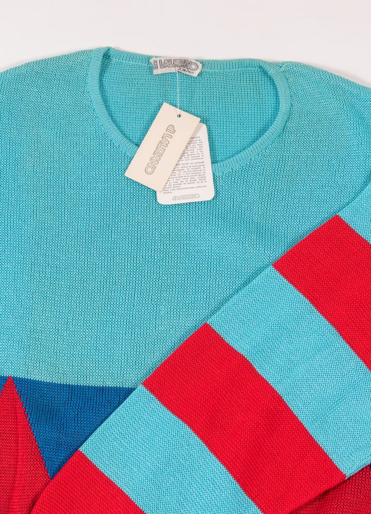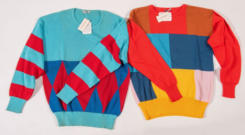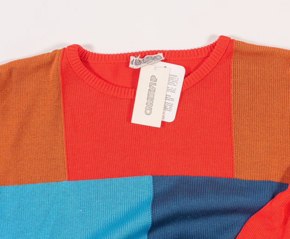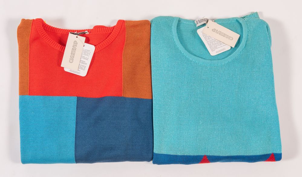 DI LAURIANO Lotto composto da due maglioncini in cotone multicolore disegnati da Giorgio Armani. Ciascuno riporta taglia 54. Composizione: 100% cotone. Ognuno accompagnato da etichetta Di Lauriano e cartellino con dettagli e specifiche del prodotto. (Difetti)
