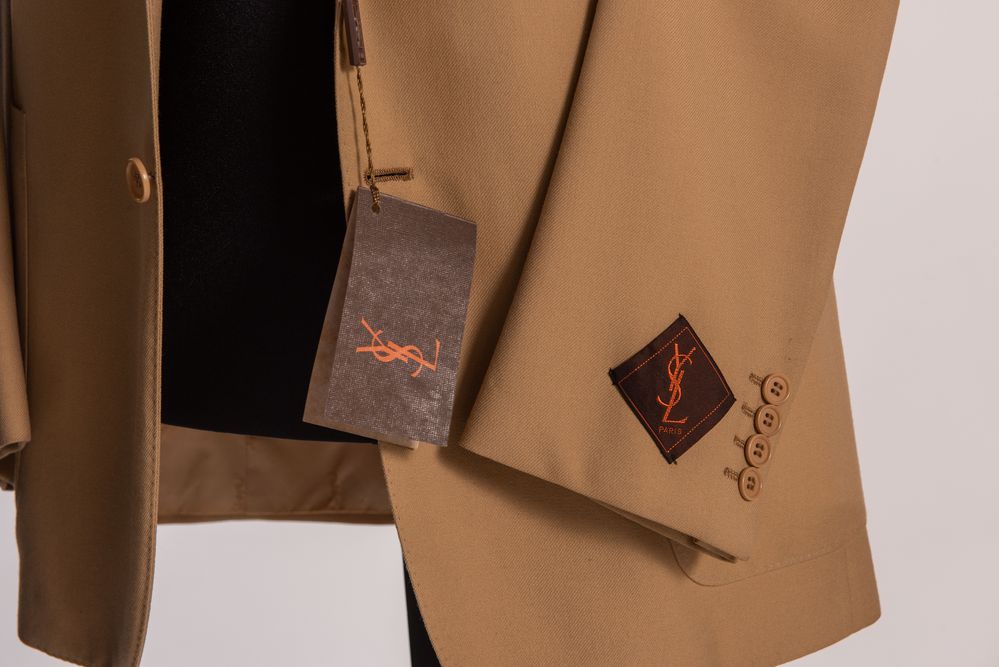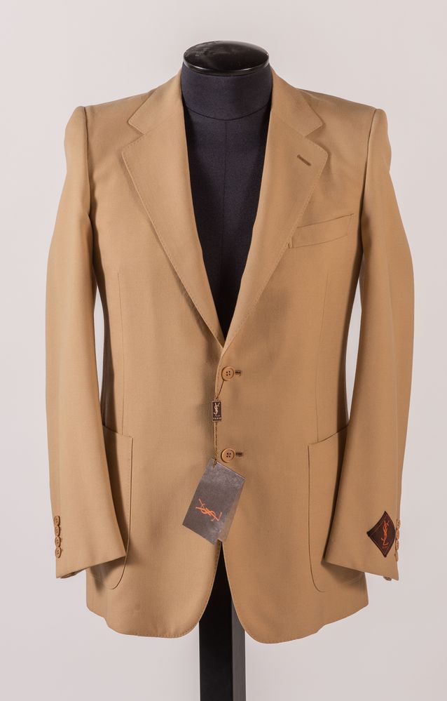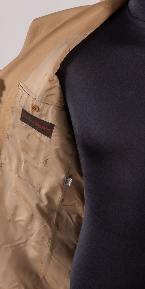 YVES SAINT LAUREN Giacca maschile in tessuto leggero di lana color beige. Riporta taglia 46. Composizione: 100% lana vergine. Reca etichetta Yves Saint Laurent e cartellino con dettagli e specifiche del prodotto.
