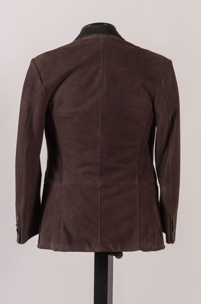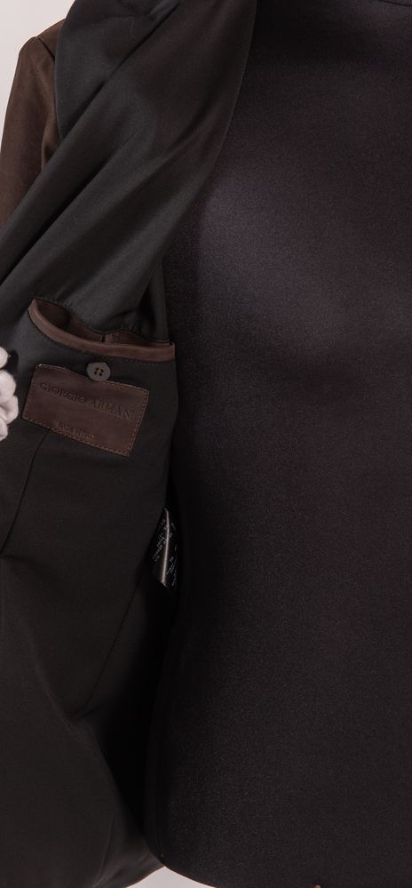 GIORGIO ARMANI Giacca in pelle scamosciata marrone con dettaglio del colletto in cotone nero. Riporta taglia 48. interno rivestito in tessuto sintetico nero. Composizione esterno: 100% vitello. Composizione interno: 58% viscosa, 44% poliestere. Reca etichetta Giorgio Armani Made in Italy. Corredata di custodia porta abiti originale. (Difetti)