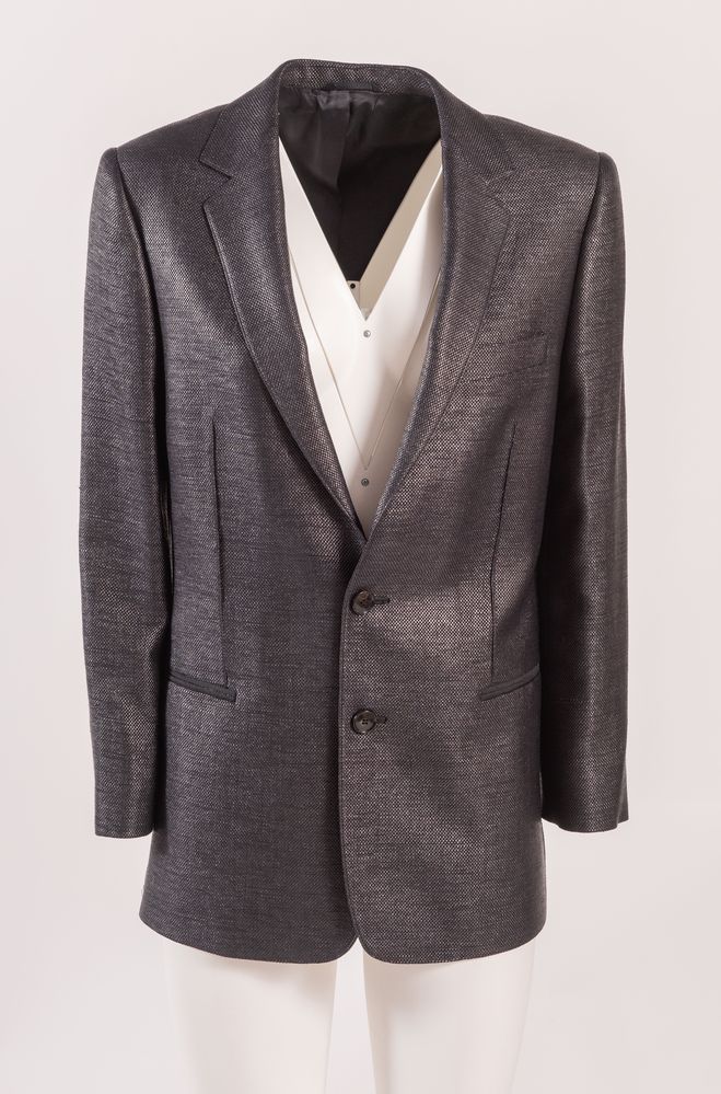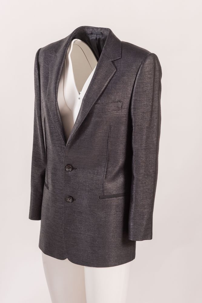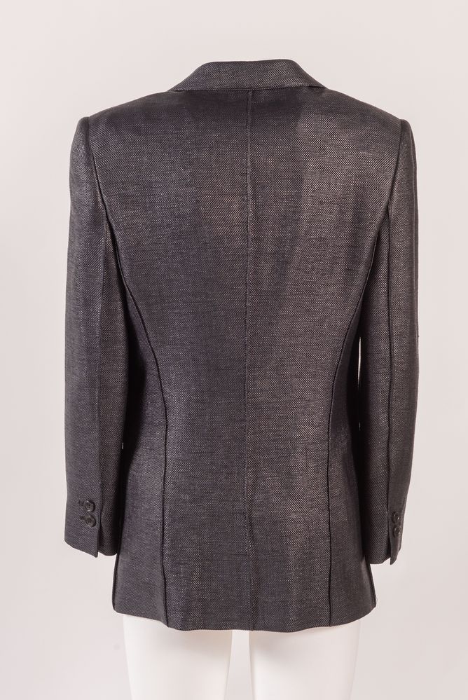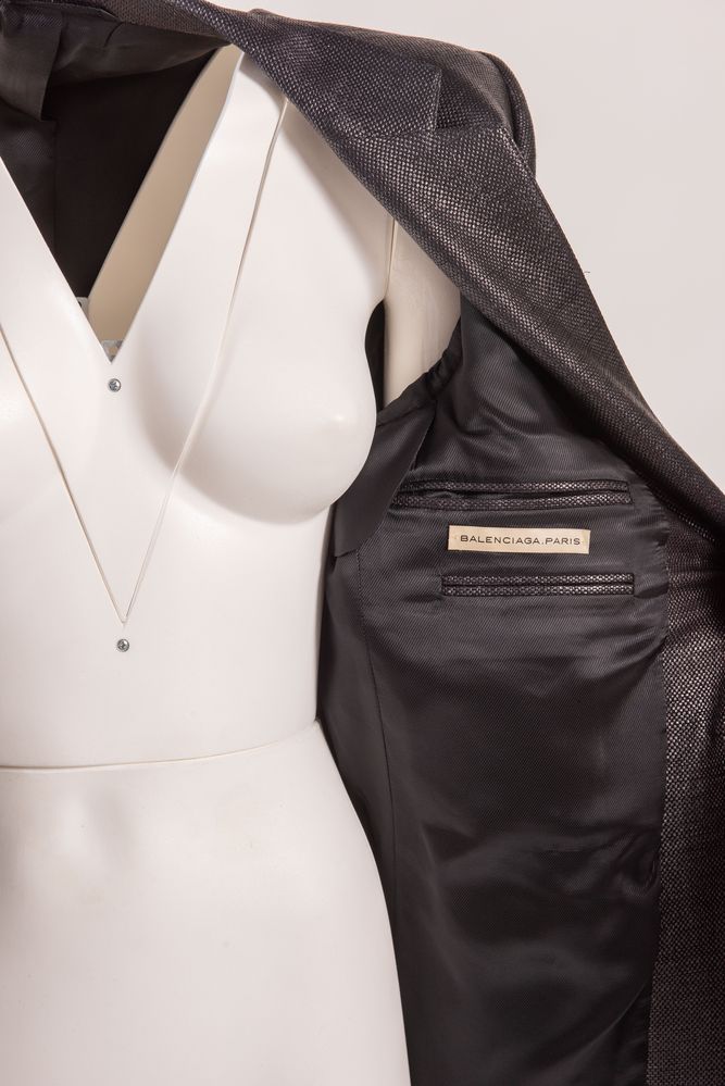 BALENCIAGA Giacca in lana e cotone semi lucida sui toni del nero. Riporta taglia 46. Interno rifinito in tessuto sintetico nero. Composiziione esterno: 75% lana, 25% viscosa. Composizione interno: 50% cotone, 50% poliestere. Reca etichetta Balenciaga.Paris. Corredata di vari bottoni di ricambio.