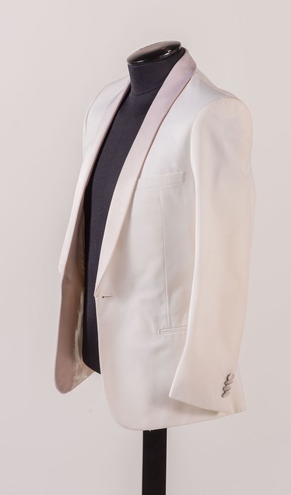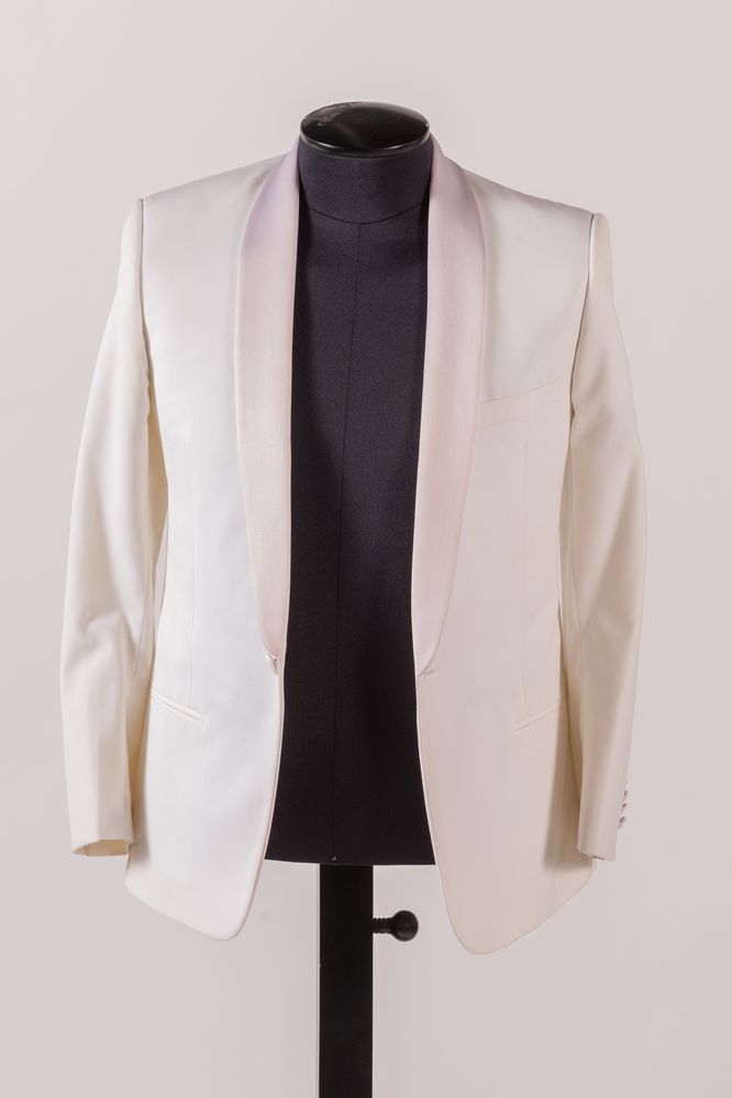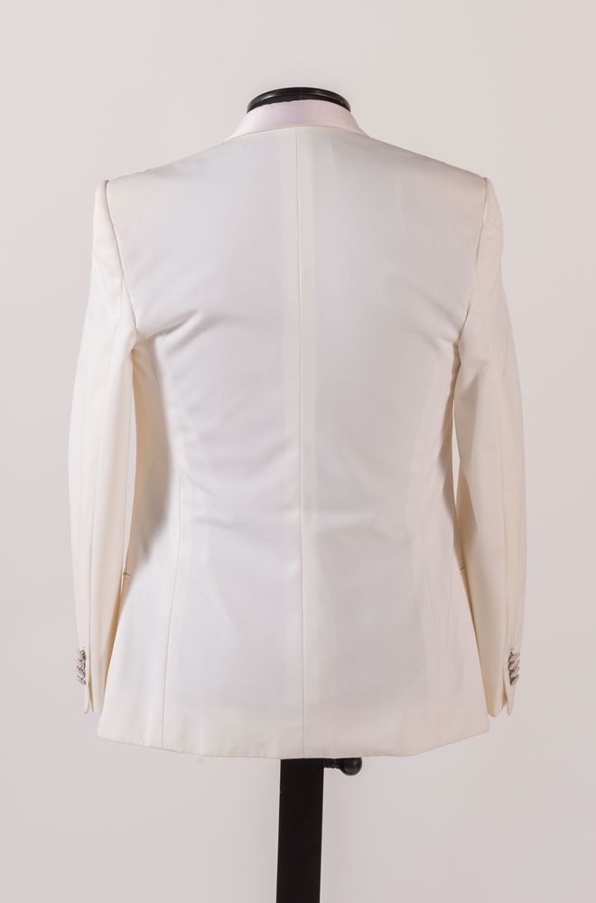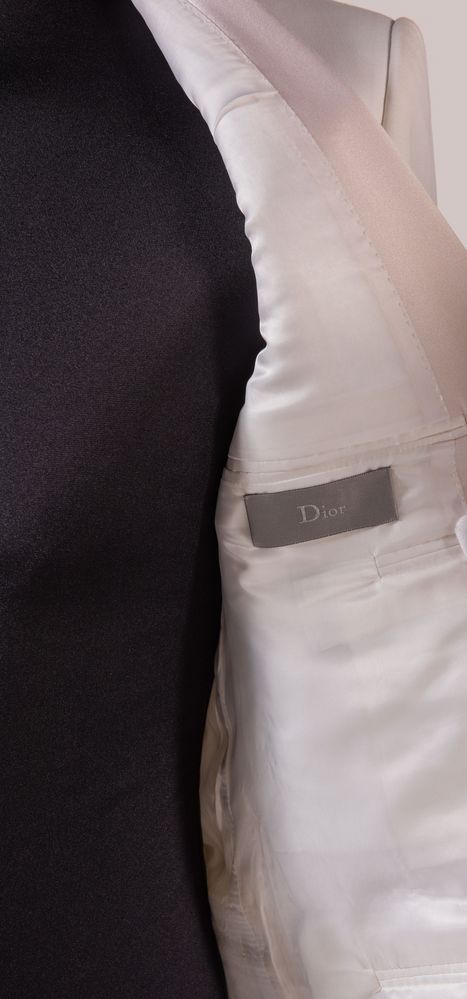 DIOR Giacca in cotone bianco con rifiniture del colletto sui toni del rosa. Riporta taglia 50. Composizione esterno: 67% poliestere, 33% cotone. Composizione interno: 100% cupro bemberg. Reca etichetta Dior. Corredata di due bottoni di ricambio. (Lievi difetti)
