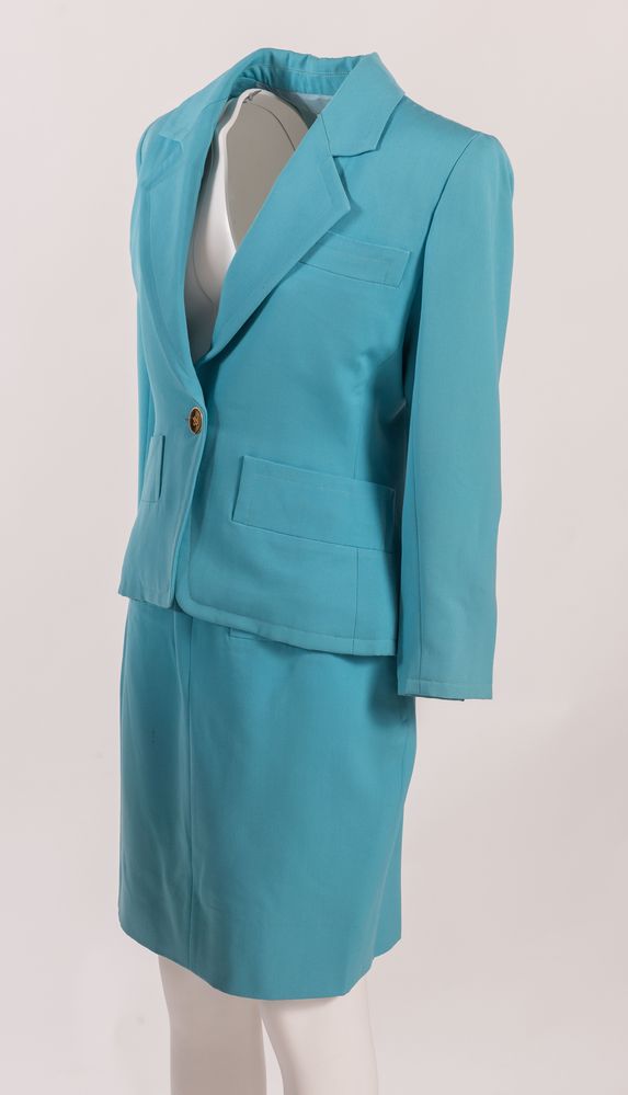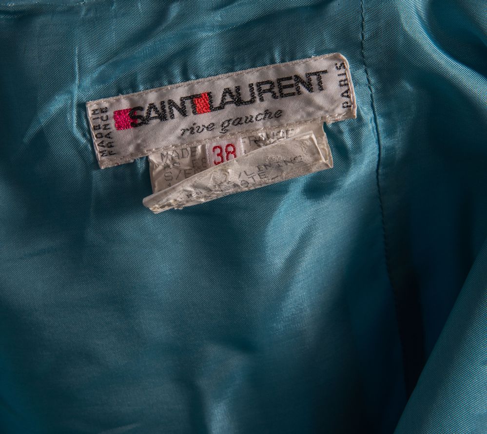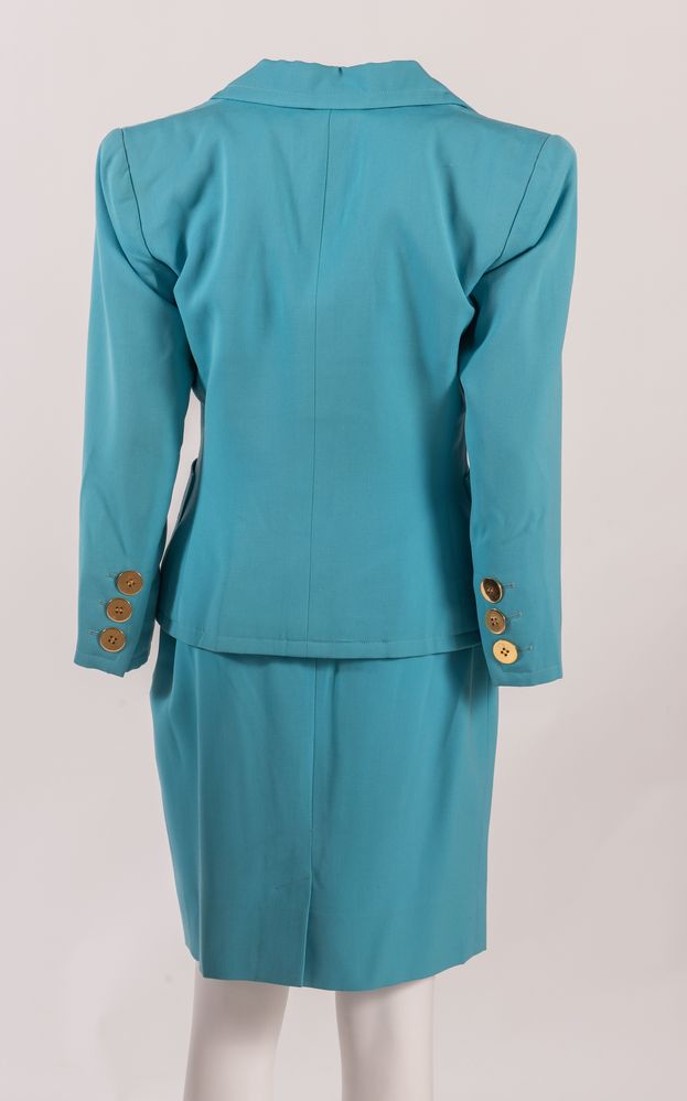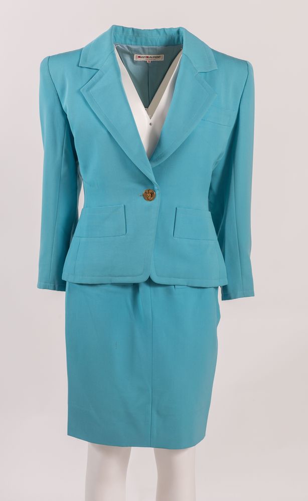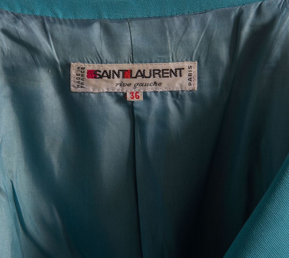 SAINT LAURENT Rive Gauche Tailleur in misto seta composto da giacca e gonna color turchese arricchito da bottoni in metallo dorato. Riporta taglie 36 e 38. Interno rifinito in fodera sintetica azzurra. Reca etichette Saint Laurent Paris Rive gauche. (Difetti)