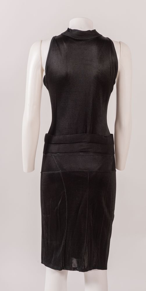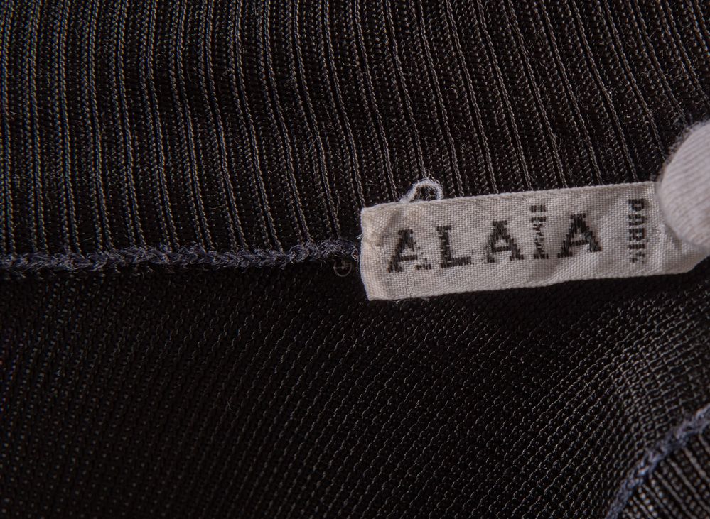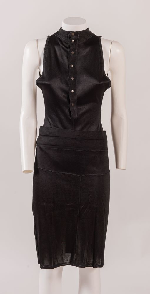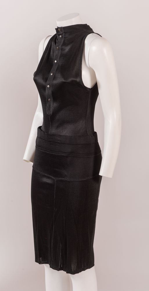 ALAÏA Set composto da body smanicato e gonna a tubino in filo di seta nera. Riporta taglia M. Reca etichetta Alaïa Paris. (Difetti e lievi mancanze)