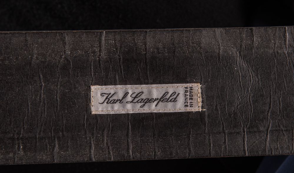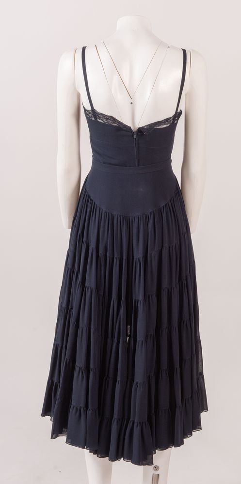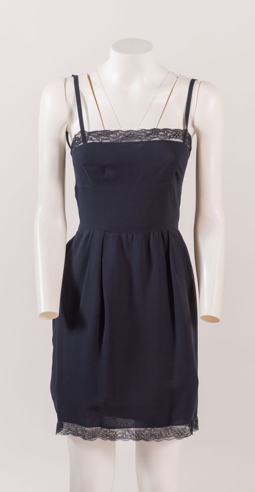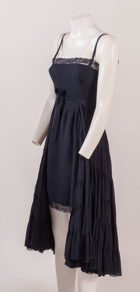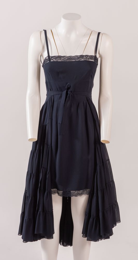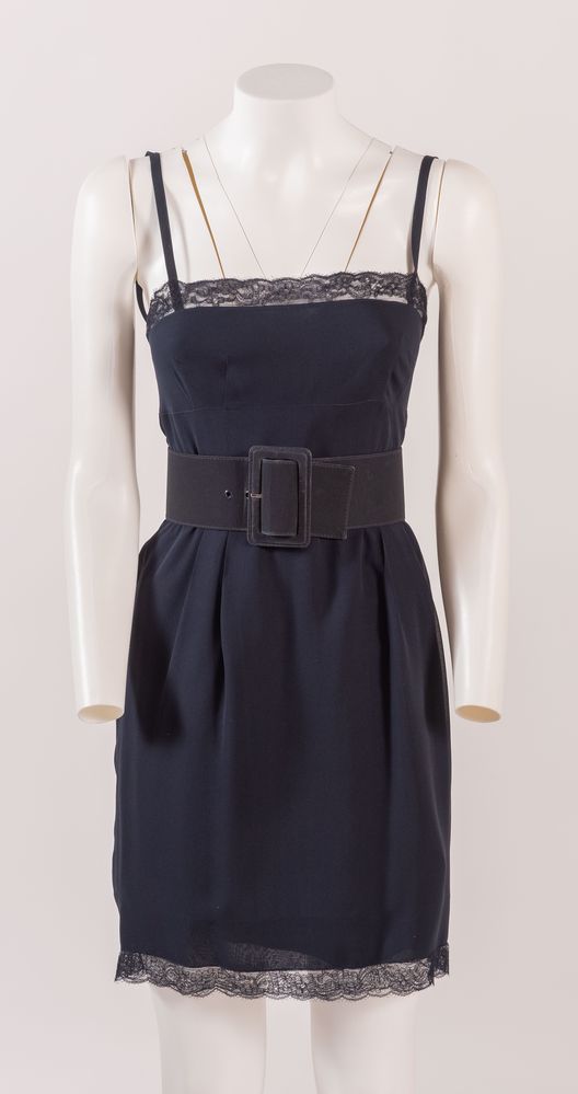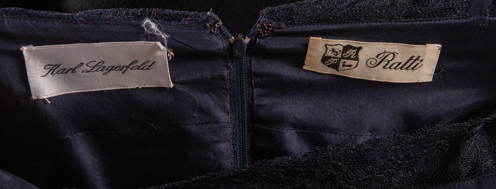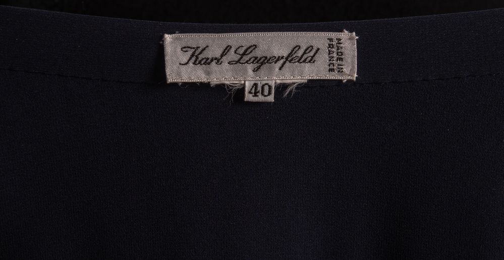 KARL LAGERFELD Set composto da mini abito, gonna a portafoglio semi-trasparente e cintura in seta blu. Anni '90. Riporta taglia 40 sulla gonna. L'abito reca etichette Karl Lagerfeld e Ratti (Boutique di Pesaro, Italia). Cintura e gonna recano etichetta Karl Lagerfeld Made in Italy. (Lievi difetti)