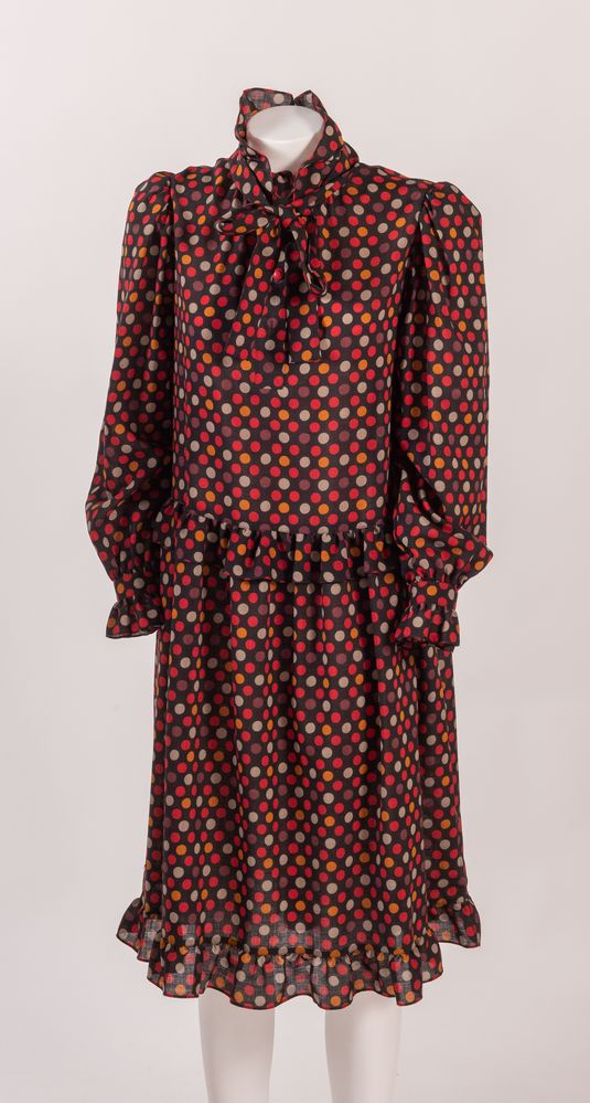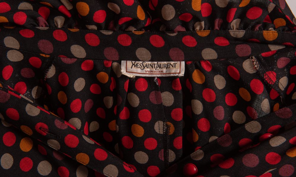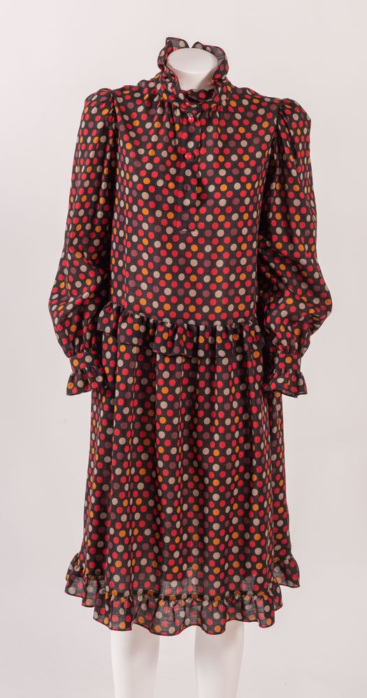 YVES SAINT LAURENT Variation Abito in cotone a pois sui toni del nero, rosso e marrone. Taglia non riportata, 40 ca. Reca etichetta Yves Saint Laurent Variation. (Lievissime mancanze)