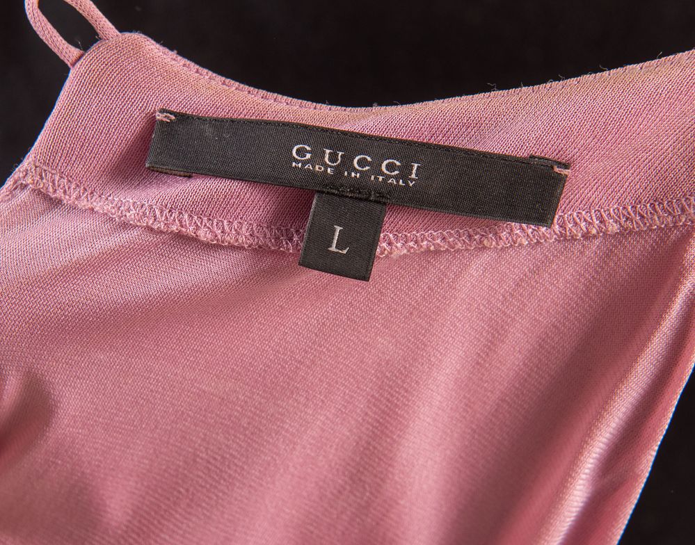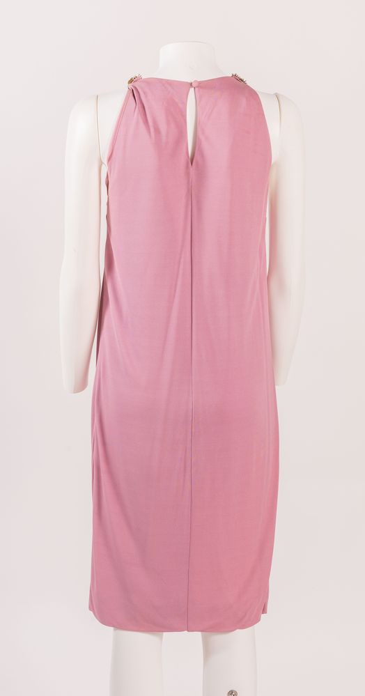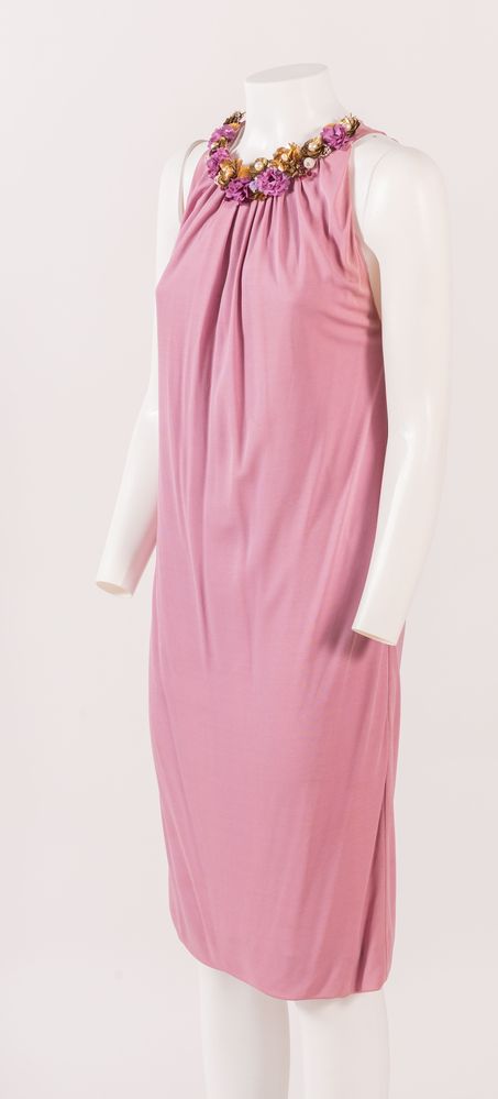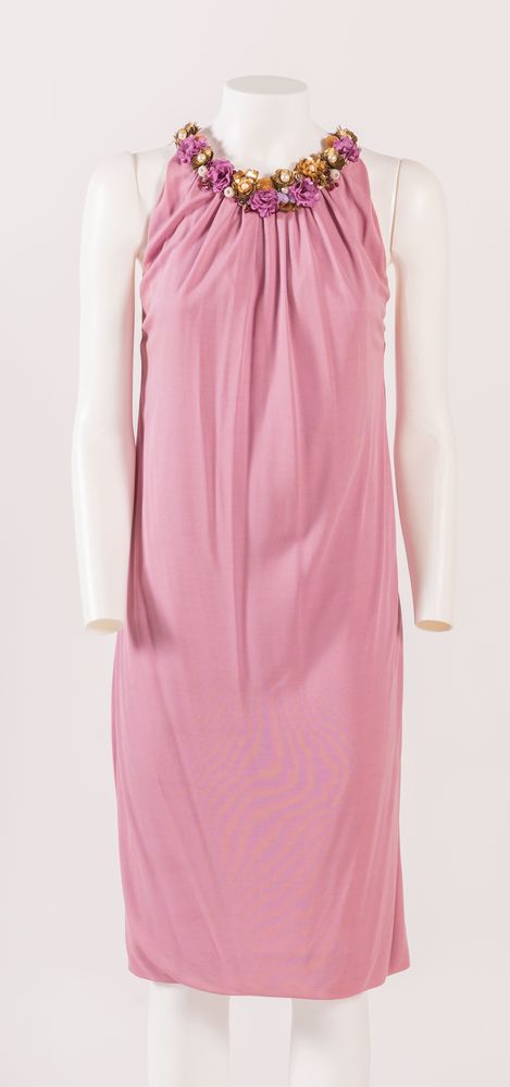 GUCCI Abito in seta smanicato sui toni del lilla con applicazioni di gusto floreale sul perimetro della scollatura. Taglia riportata: L. (Lievi mancanze)