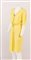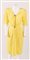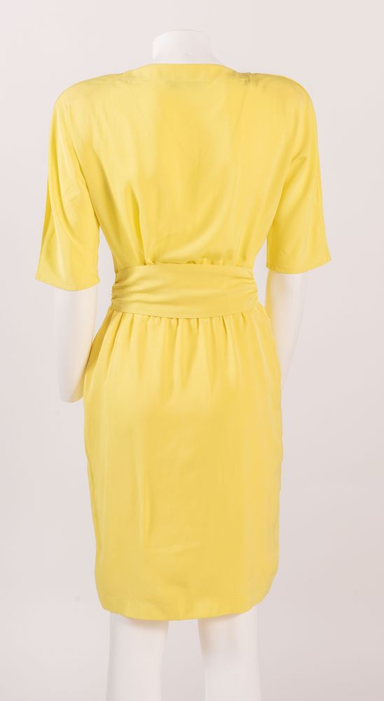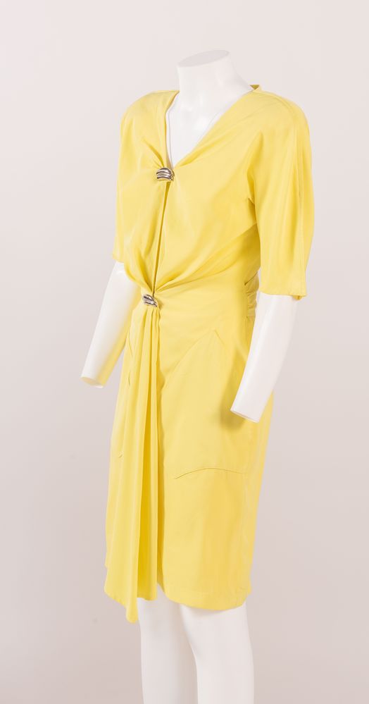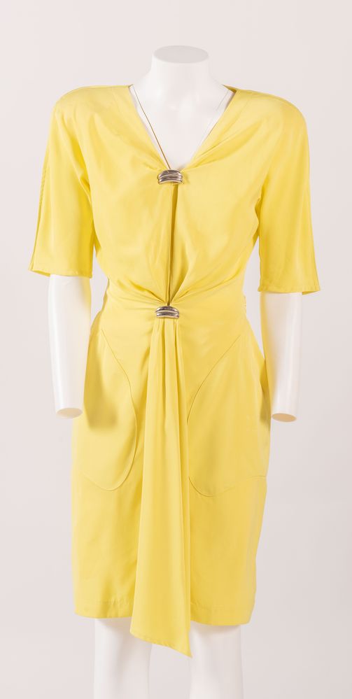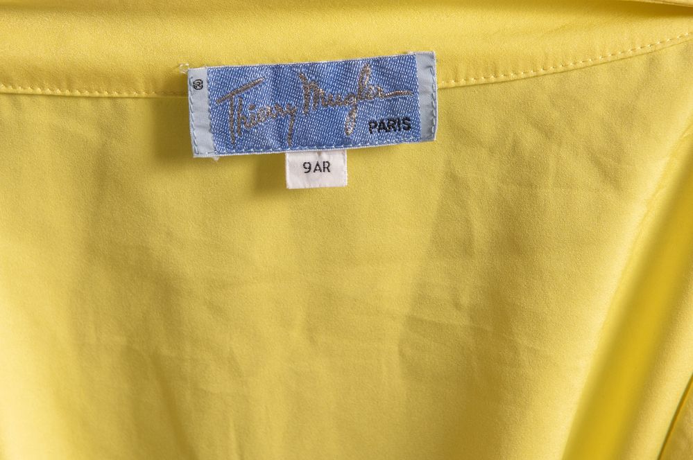 THIERRY MUGLER Abito di media lunghezza in seta color giallo con spalline imbottite e bottoni in metallo argentato. Riporta taglia 9AR. Reca etichetta Thierry Mugler Paris. (Lievi difetti)