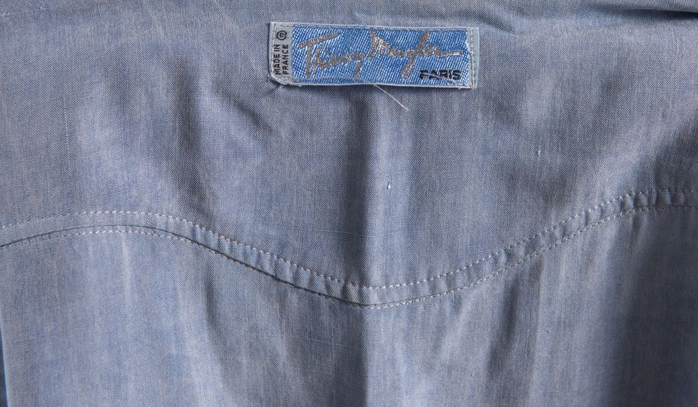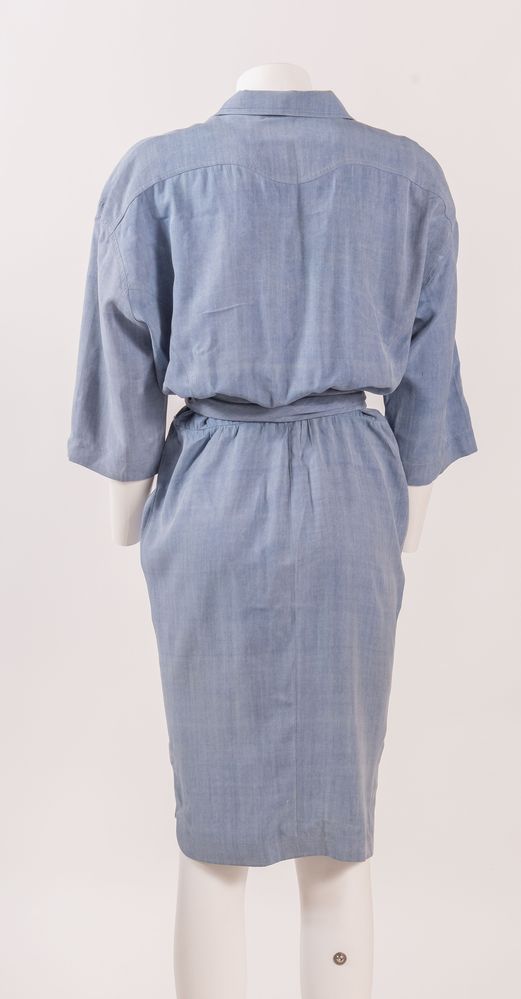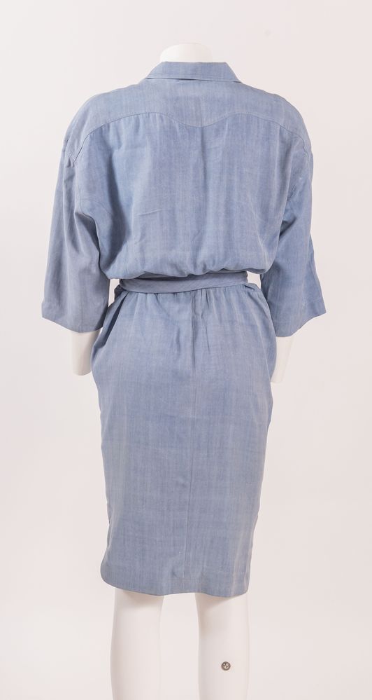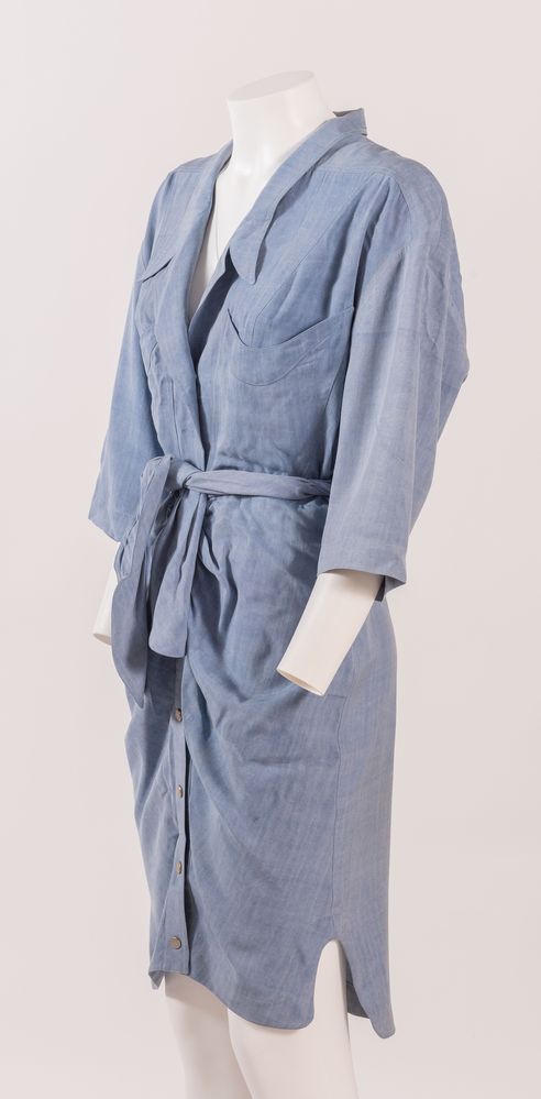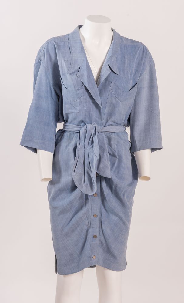 THIERRY MUGLER Abito in seta sui toni dell'azzurro con cintura coordinata e dettaglio dei bottoni in metallo argentato. Taglia non riportata: 42 ca. Composizione: 100% seta. Reca etichetta Thierry Mugler Paris Made in France. (Lievissime mancanze)