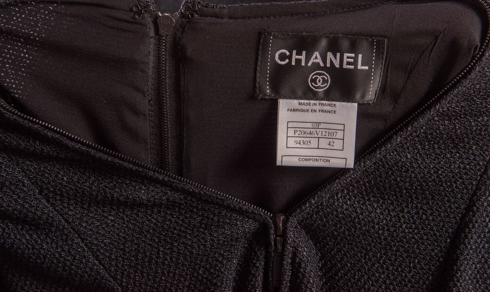 CHANEL Abito lungo in cotone lavorato nero con apertura regolabile con zip in metallo argentato scuro. Riporta taglia 42. Composizione esterno: 69% viscosa, 21% cotone, 10% poliammide. Composizione interno: 94% seta, 6% elastano. Reca etichetta Chanel CC Made in France. Corredato di pezzo di stoffa originale per la riparazione.