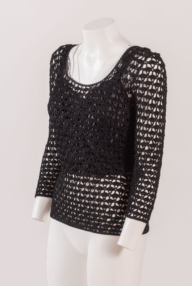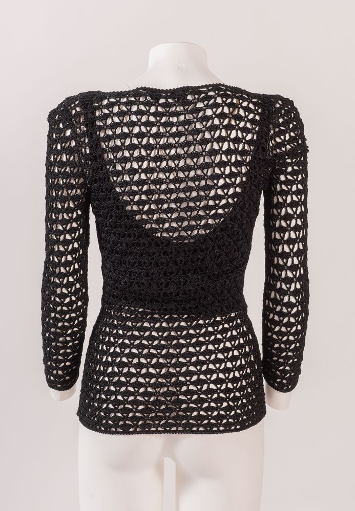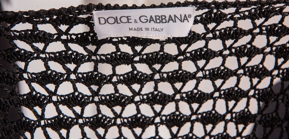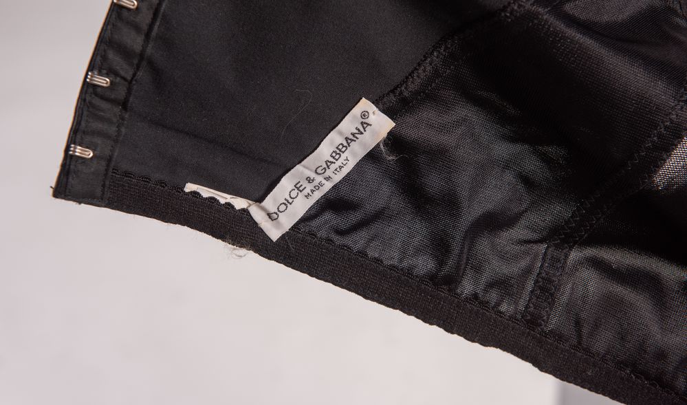 DOLCE & GABBANA Set composto da bustino nero semi lucido e top a maniche lunghe lavorato a maglia traforata. Taglie non riportate: 40/42 ca. Ciascun elemento reca etichetta Dolce & Gabbana Made In Italy. (Lievi mancanze)